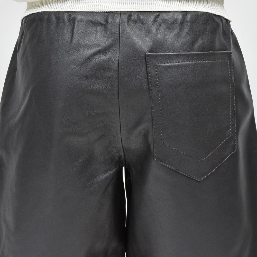 裾幅広めのたっぷりしたシルエット。ウエストはシャーリング。イージーですが、レザーという素材の特性上ピリッと決まっているように思います。