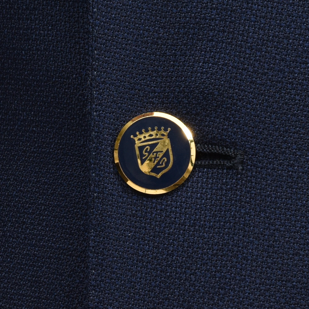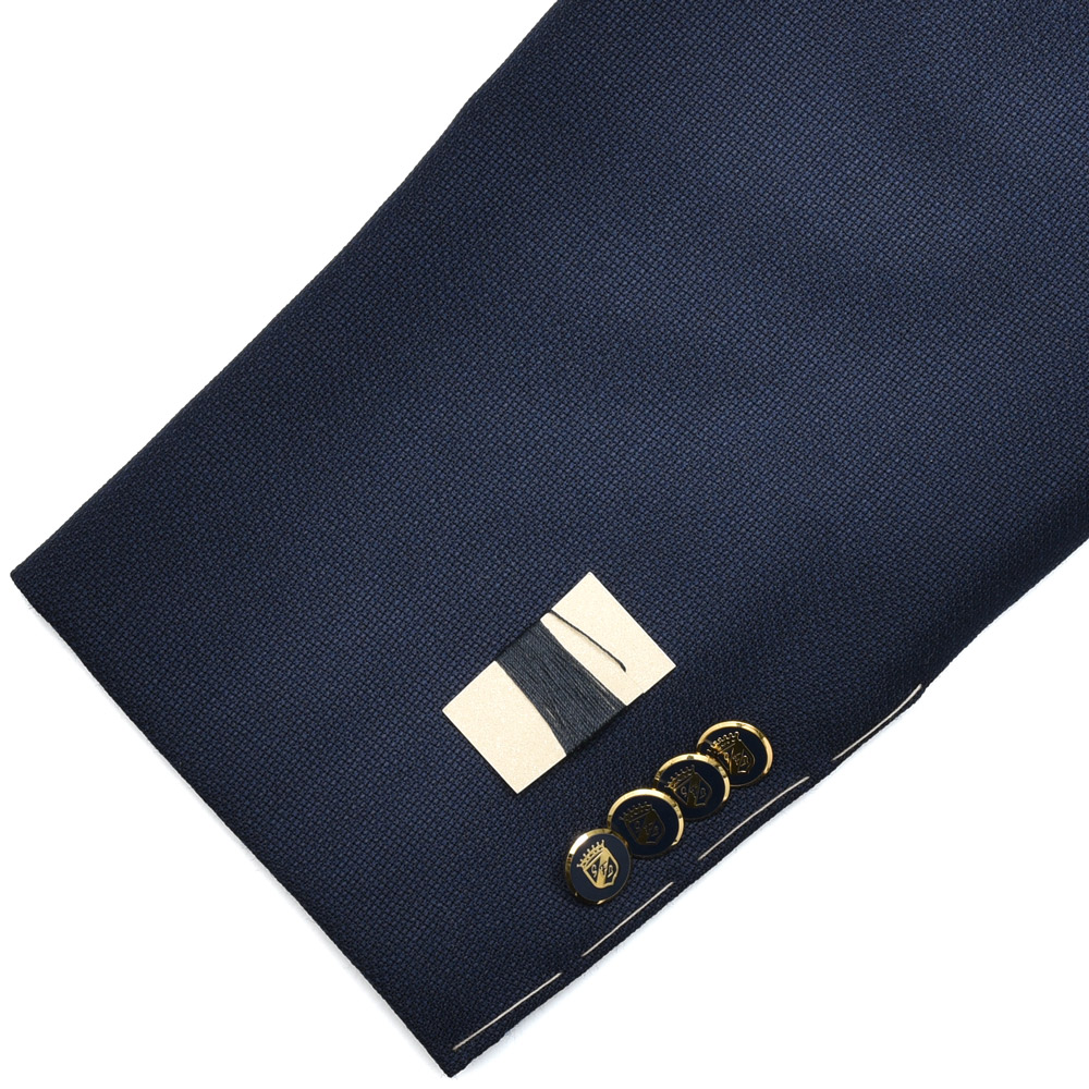 目を引くのは、オリジナルのエンブレムが施された金のメタルボタン。