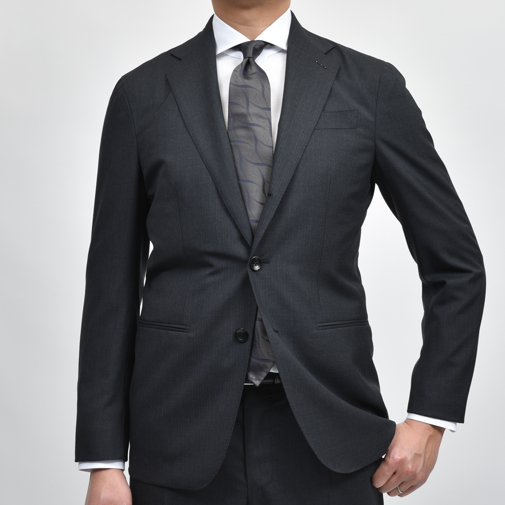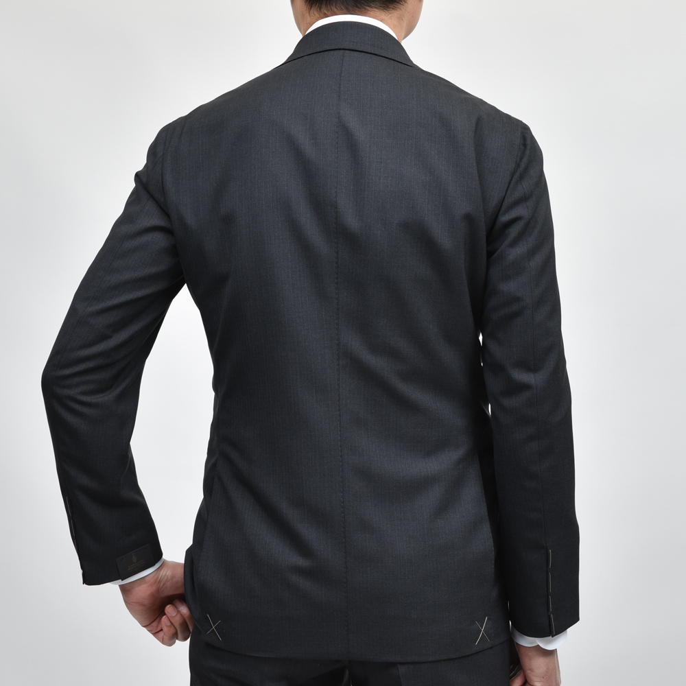 GIANFRANCO BOMMEZZADRIのチャコールグレーのオルタネイトストライプスーツ。