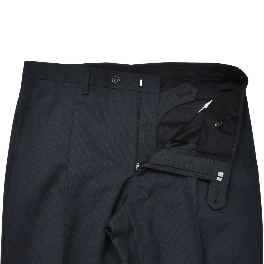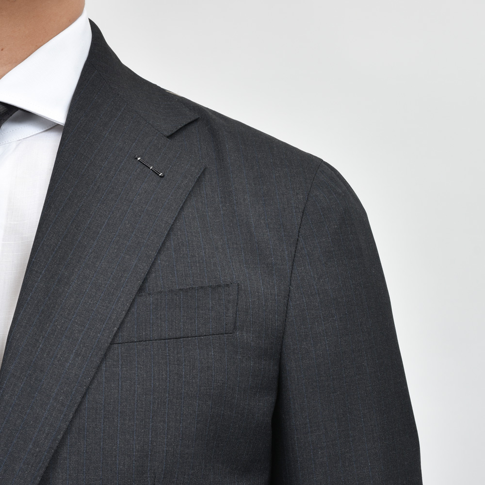 グレーのストライプはモノトーンの濃淡で表現するスタイルが多いですが、こちらは敢えてのブルーがミックスされていまして、スマートさの中にイタリアらしい色気と遊び心が込められています。