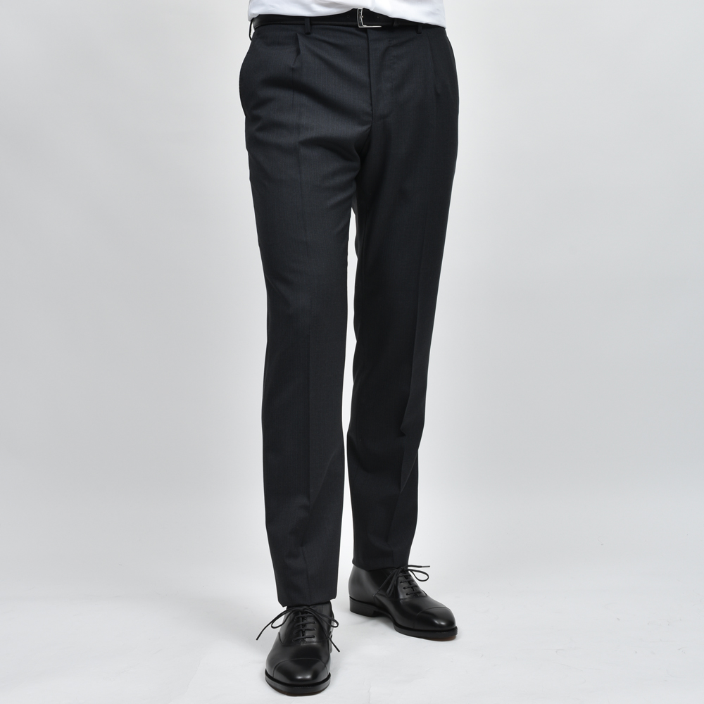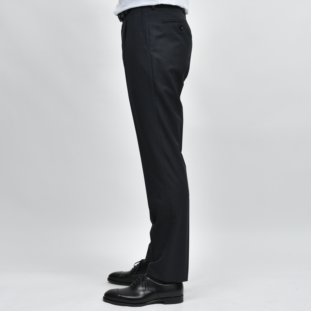 ジャケットは柔らかなナチュラルショルダー仕様。ウエストは適度にシェイプされ、すっきりとしたシルエット。パンツは1プリーツで腰回りにゆとりを持たせたテーパードシルエット。