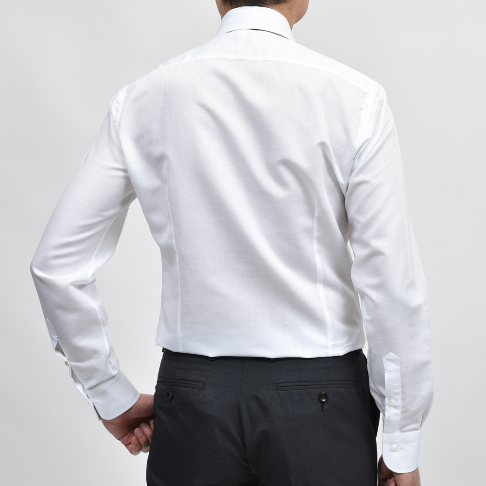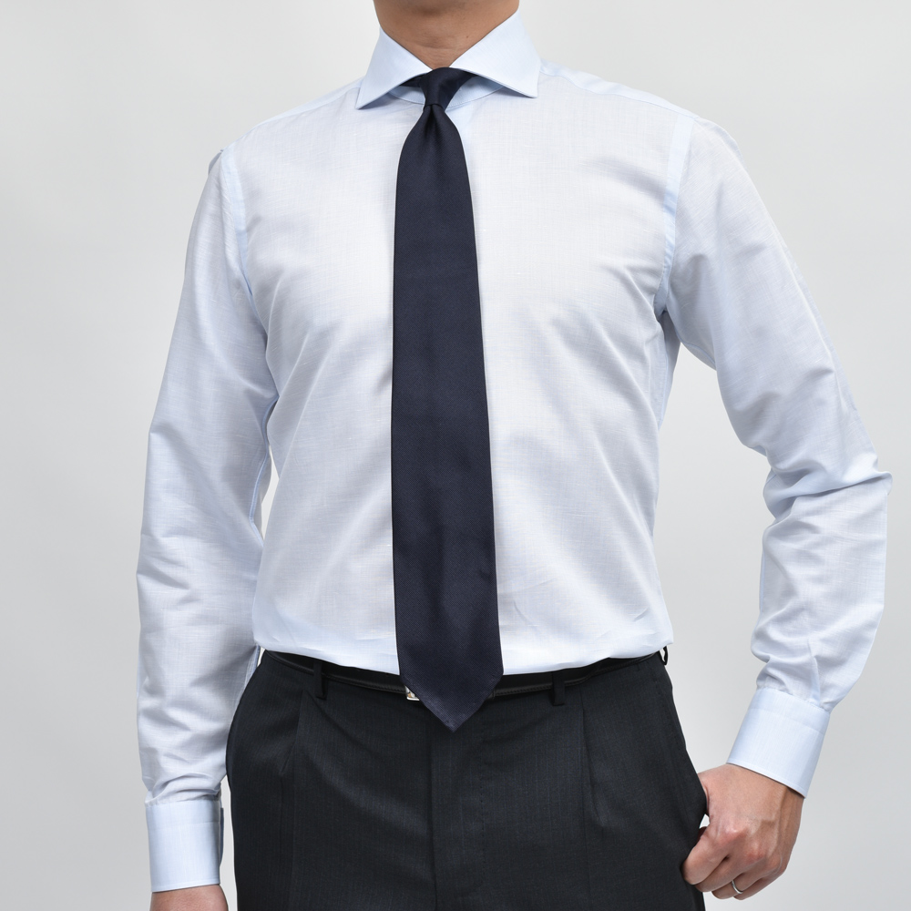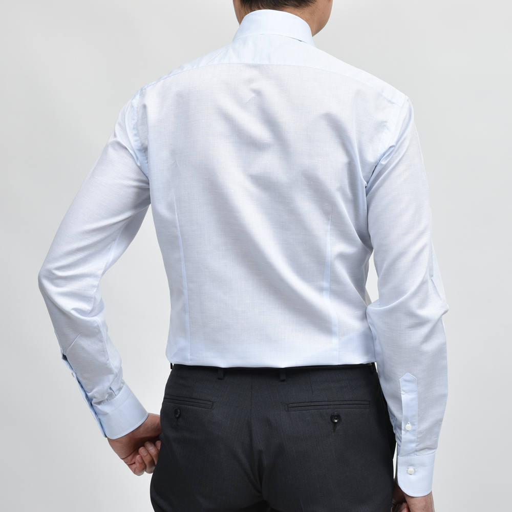 ドレスシャツは肌に直接触れる分、生地が重要となってきます。コットンリネンのドライな感触。春夏に適した一着です。