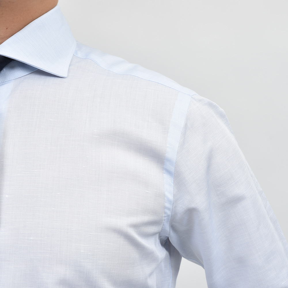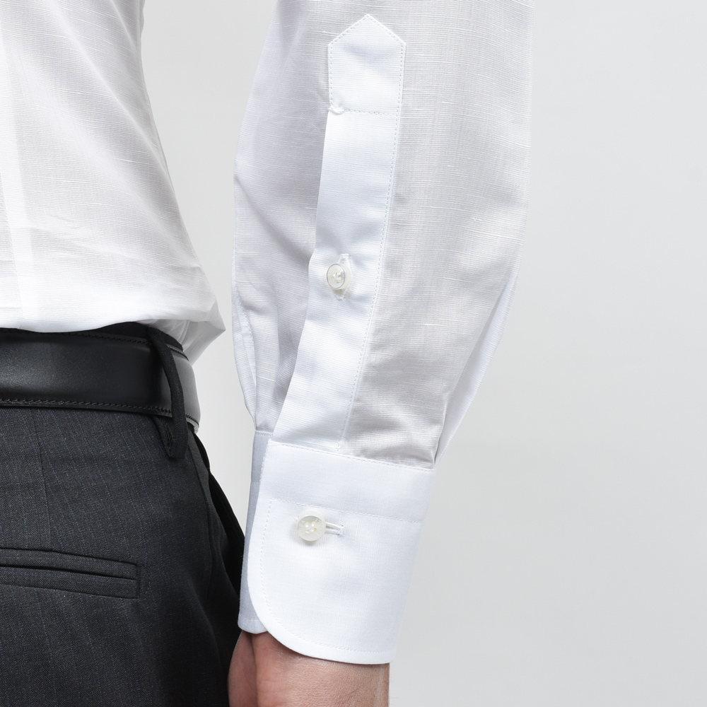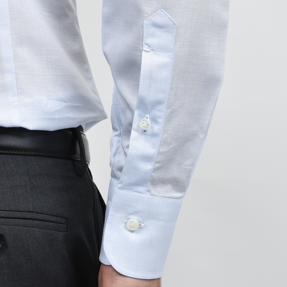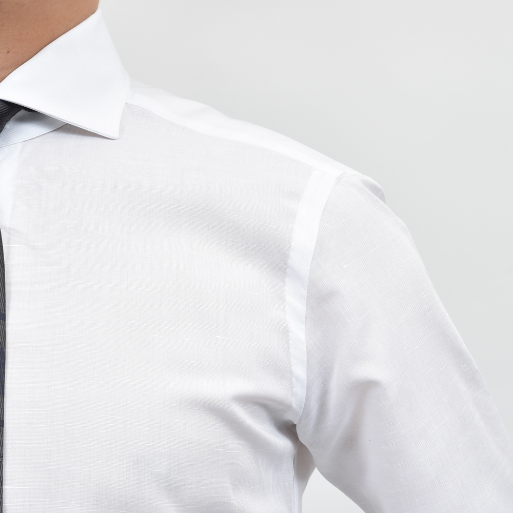 リネン混特有のメランジ感や若干の節のあるスラブ感が特徴ですが、あくまでドレスシャツですのでクリーンな雰囲気で着用頂ける素材をチョイスしました。
