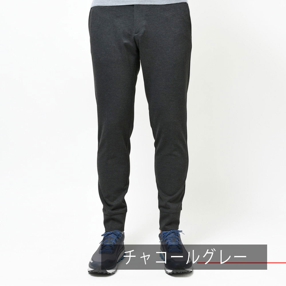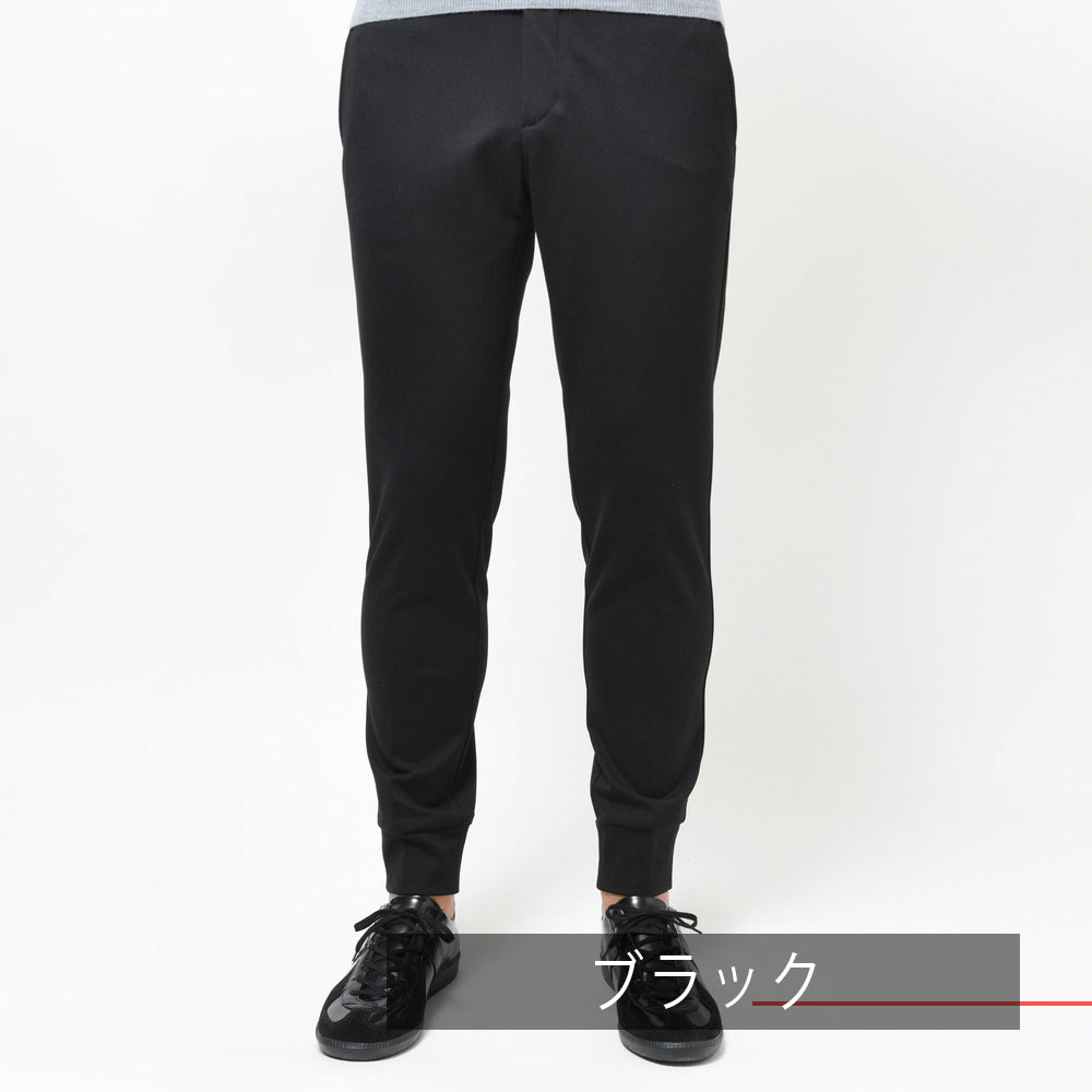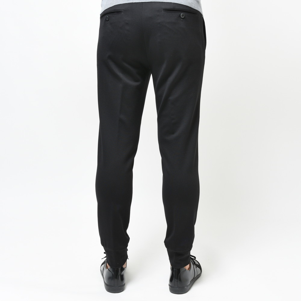 スポーティなパンツではあるんですが、リブの部分を共生地にしてしまう事によって全体の統一感を高めています。さらに言うと生地自体もレーヨンナイロンを用いていますが非常に落ち着きのあるタッチになっていますので、カジュアルジャケットのスタイルと合わせても何ら問題ないパンツです。