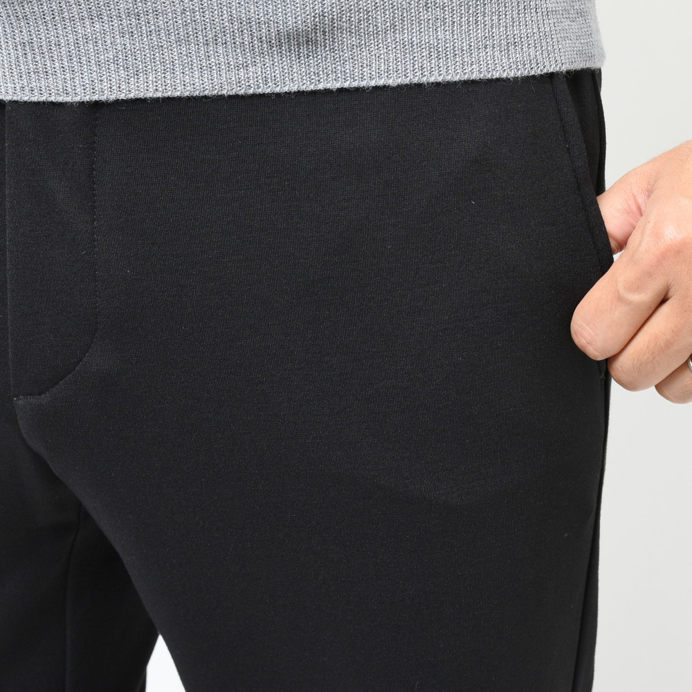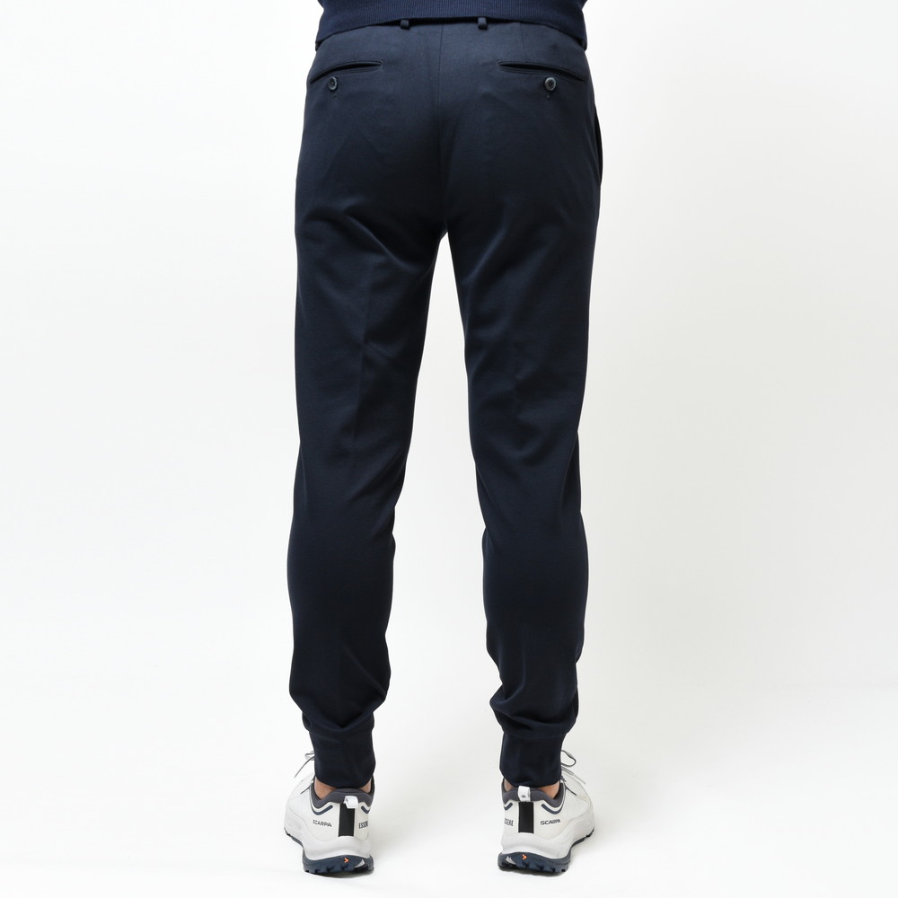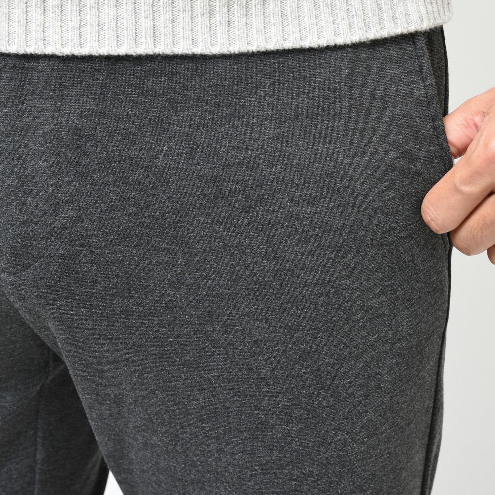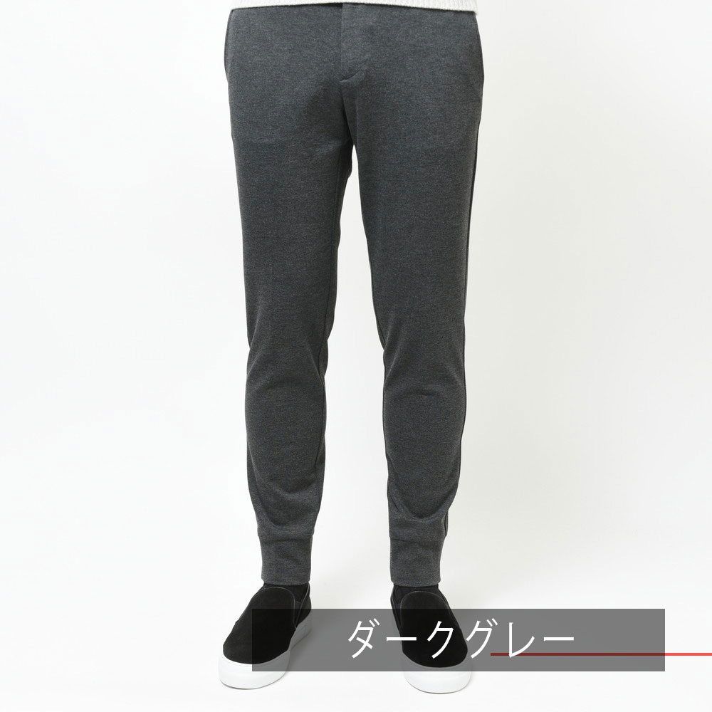 スポーティなパンツではあるんですが、リブの部分を共生地にしてしまう事によって全体の統一感を高めています。さらに言うと生地自体もレーヨンナイロンを用いていますが非常に落ち着きのあるタッチになっていますので、カジュアルジャケットのスタイルと合わせても何ら問題ないパンツです。