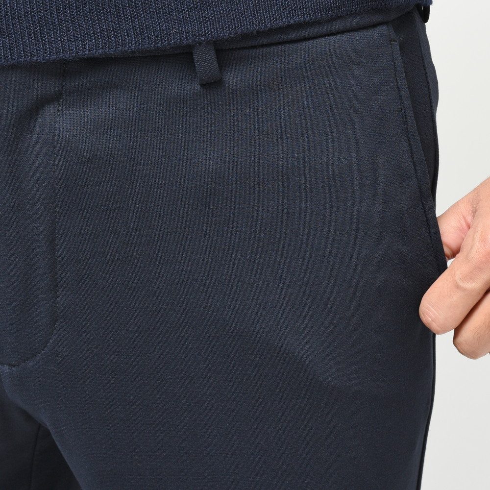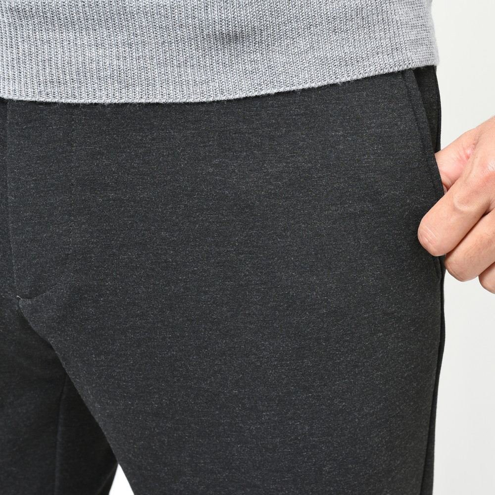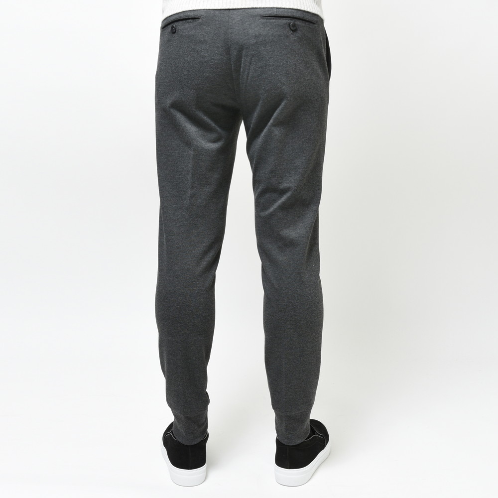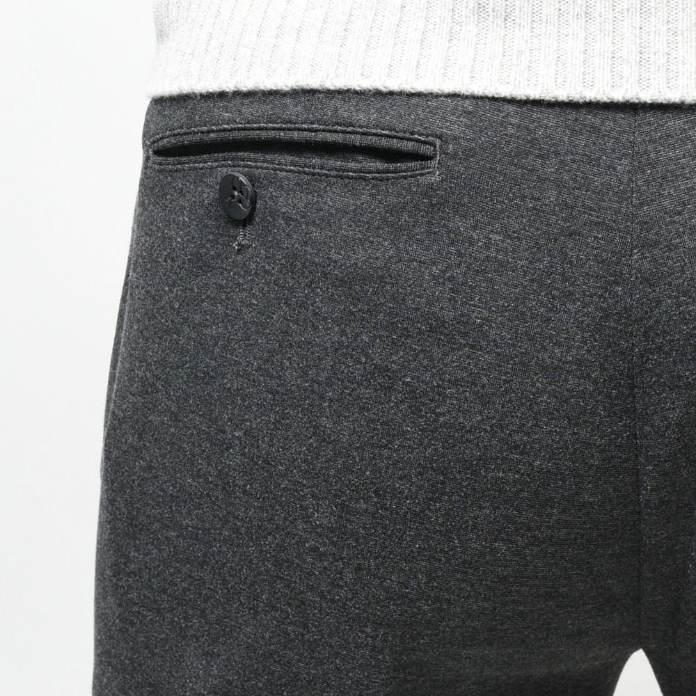 リブパンツでは定番のウエストシャーリングではなく、ベルトループを備えたドレス仕立てになっているのもそういった理由があります。