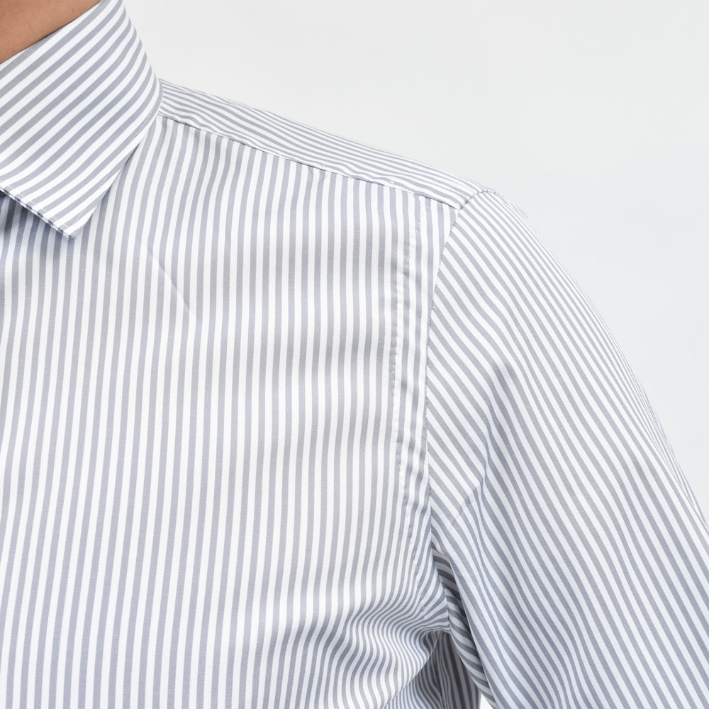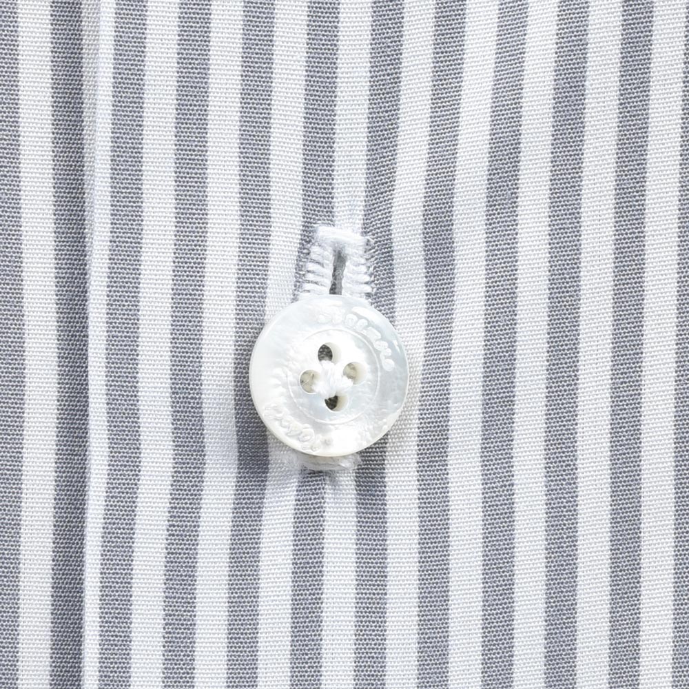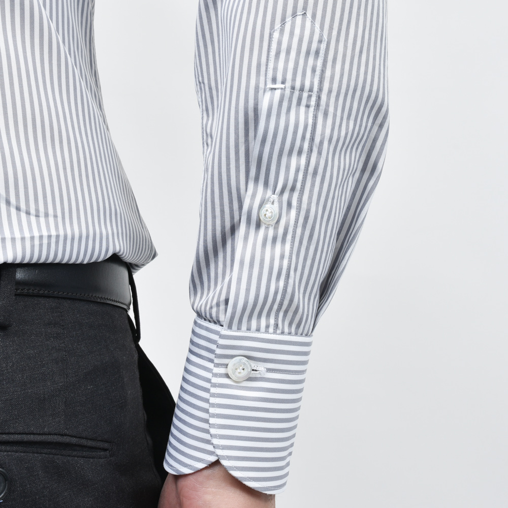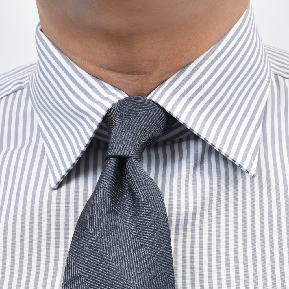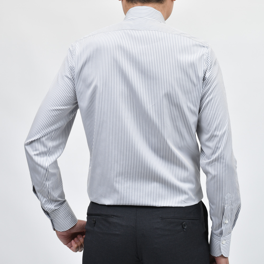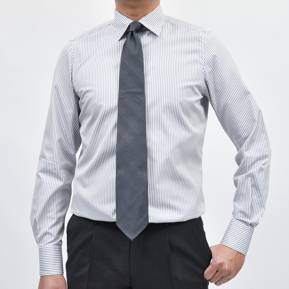 モノトーンのドレススタイルを考える際に白無地シャツ以外で必要となるのがグレー無地またはグレーストライプのシャツです。