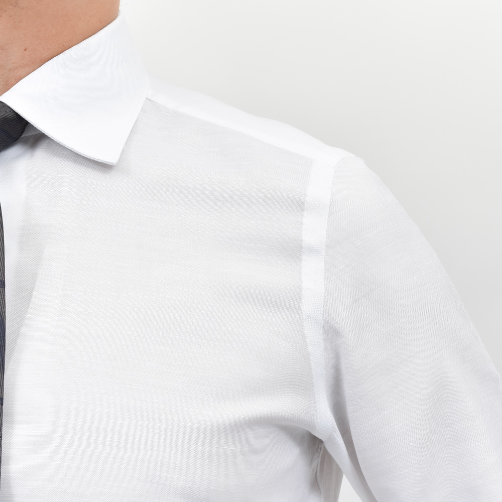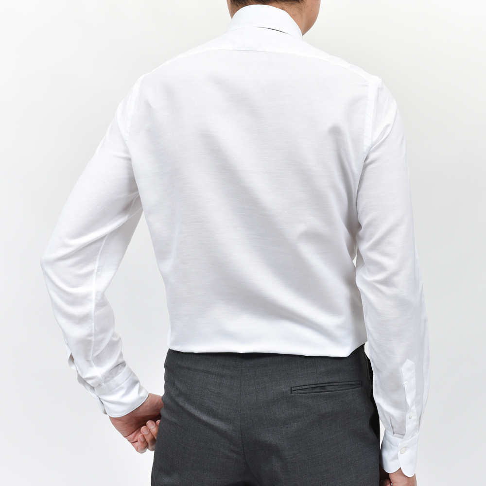 ただあくまでもドレスシャツ。糸は細く織りの密度も高いため光沢感と滑らかさが感じられる生地感となっています。