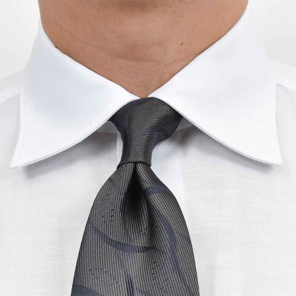 襟型はセミワイドカラー。やや広めに襟が開いているので首まわりがスッキリとした印象になります。