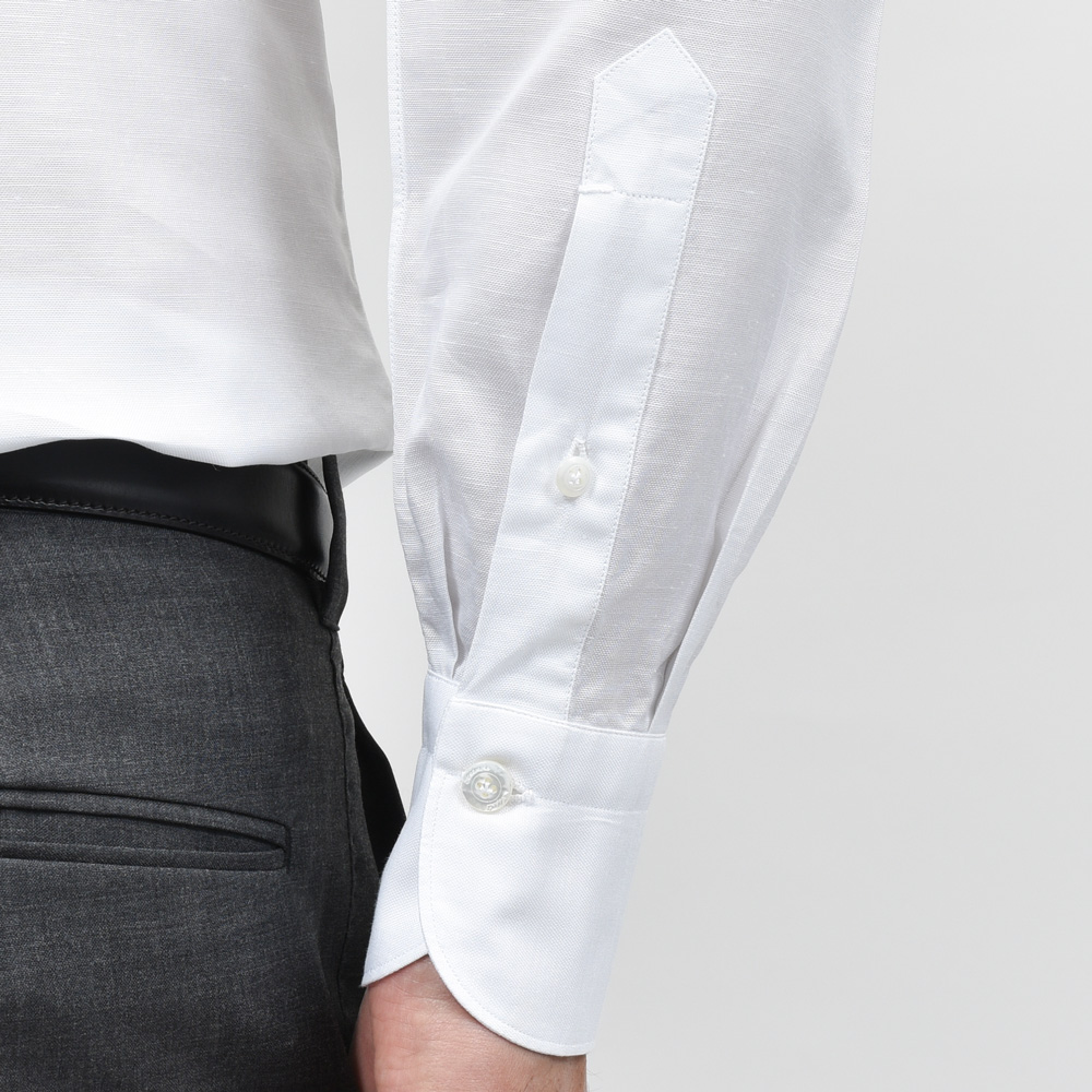 Finamoreのドレスシャツは機械縫製では再現できない手縫いならではの着心地の良さと補強が施されています。襟付け・ヨーク・袖ぐりの縫い代始末・剣ボロカンヌキ止め・両裾ガゼット・ボタン・ボタンホールと全部で7つの工程がハンドで縫製されています。特に袖付けなどは体の動きに合わせて柔軟に仕立てられ、機械縫製に比べて動きやすく、着心地の良さにつながっています。