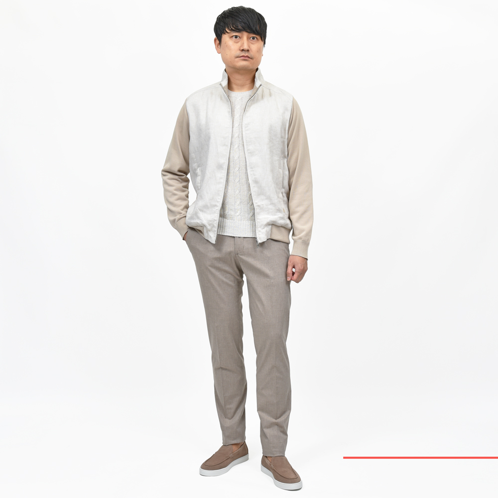 からだの動きに合わせて稼働する部分はジャージファブリックにすることでストレスを感じさせない着心地になっており、且つ全体としてのシルエットはシャープ。この雰囲気はイタリア人のDNAに刻まれているのかな・・・というくらい、完成されたエレガントな仕上がりです。