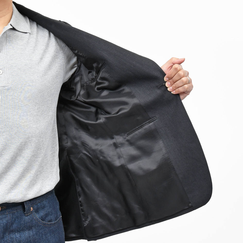 ・フロント1ボタン・腰フラップポケット・胸バルカポケット・内ポケット左右