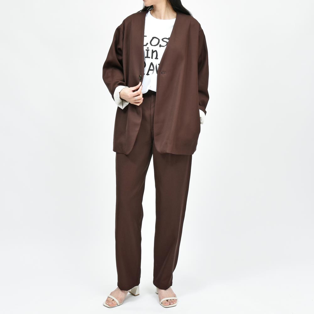 メリハリを効かせないというところがポイントで、ゆとりを持たせすぎず、裾にかけて絞り過ぎず。ウエストシャーリングパンツですがドレス見え、上品見えするようにすることで大人のリラックスパンツとしての完成度を高めたイメージです。