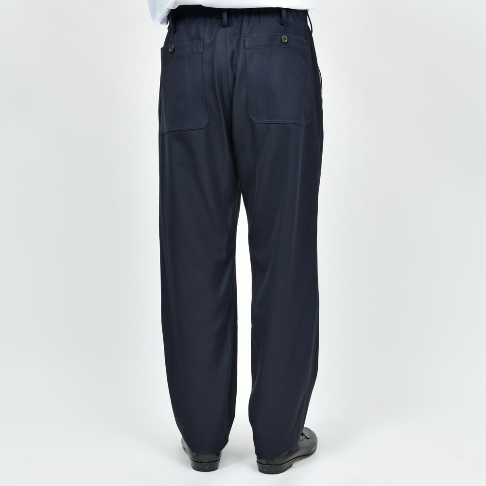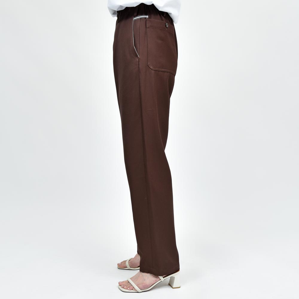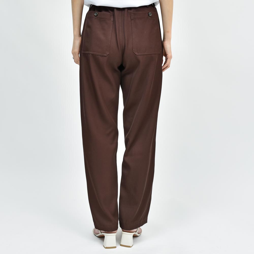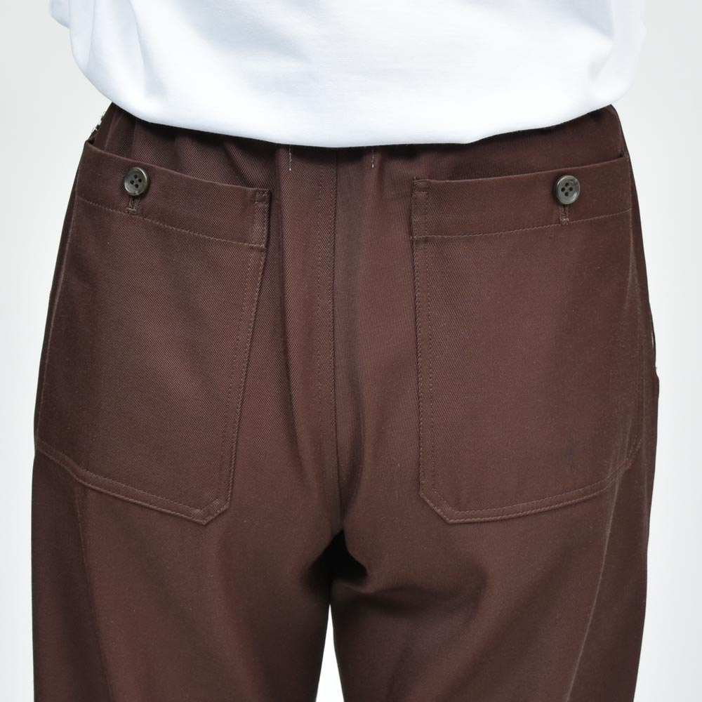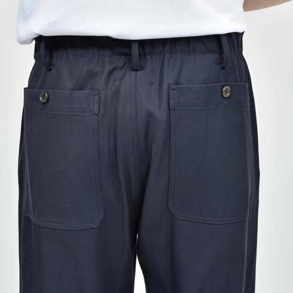 レーヨンコットンツイルのしなやかな生地にウエストのシャーリング部分がバックのみに設定、タックインのスタイルの場合でもよりすっきりとした雰囲気で着用いただけます。