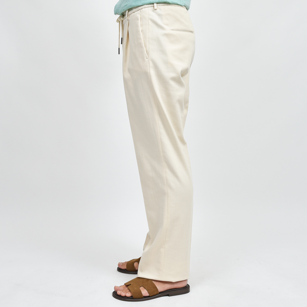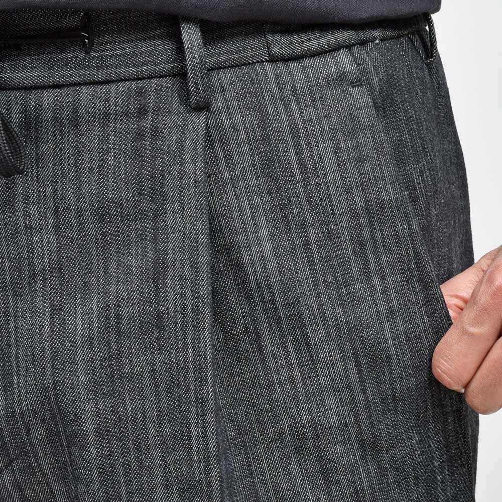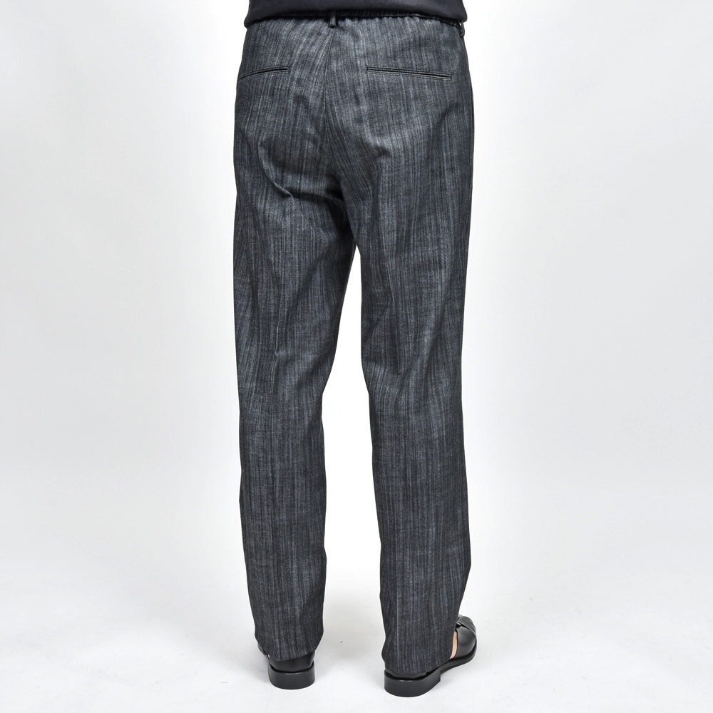 仕様はNEWMANニューマン同様の1プリーツ&ウエストシャーリング、ドローコードは内側に収納出来ドレスパンツとしての穿けるようなデザインですが、股上を少し深く、裾幅を広くすることで全く違ったラインを描きます。