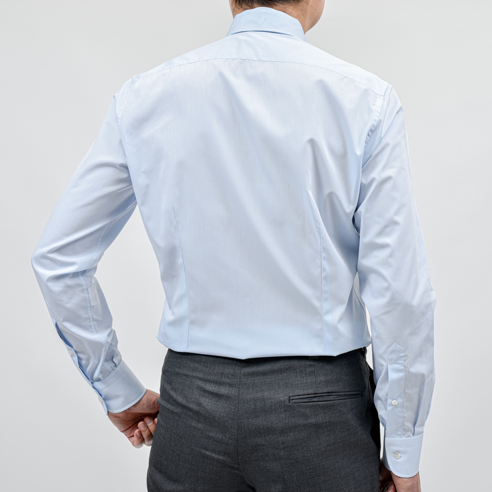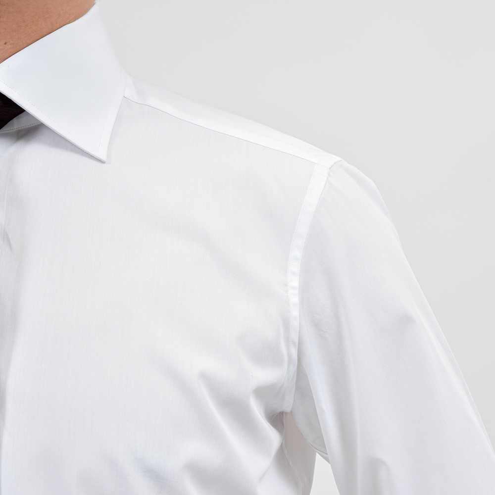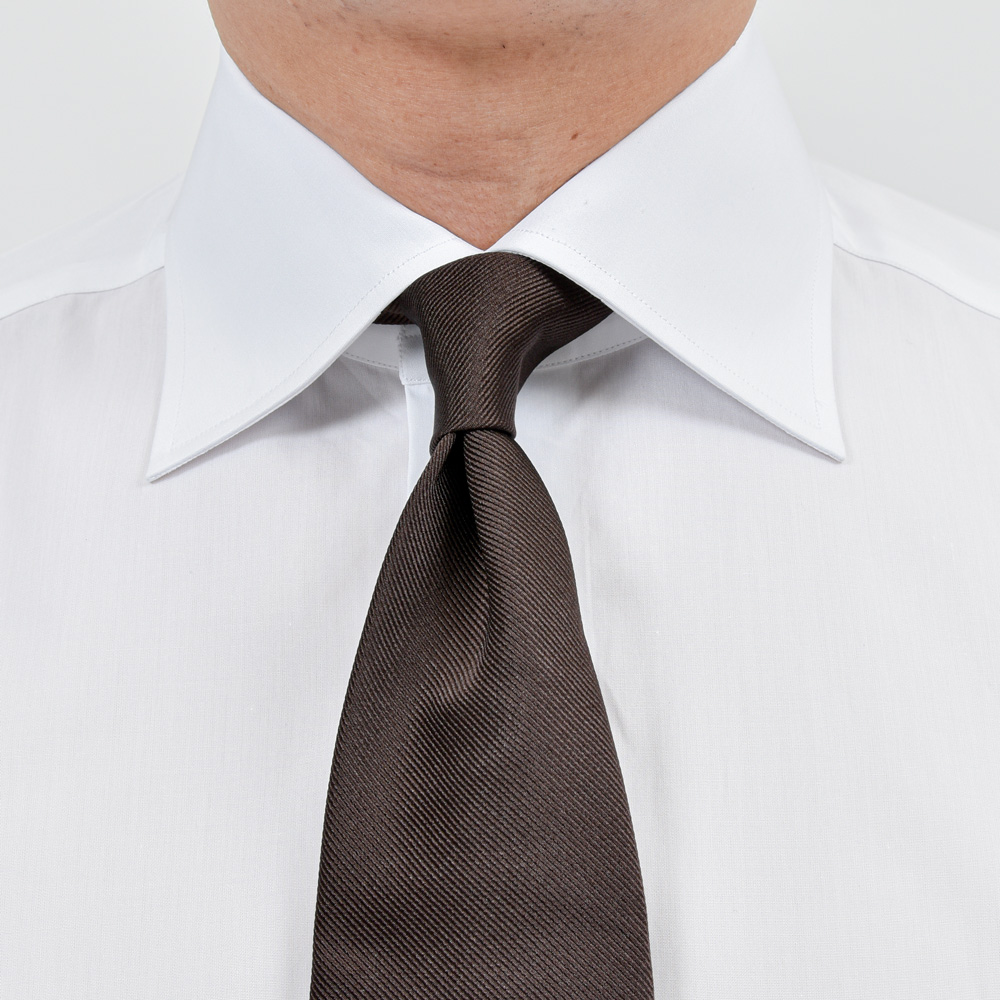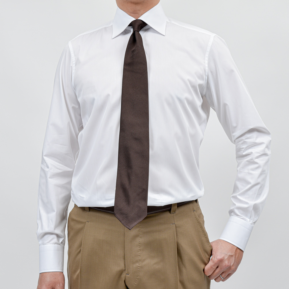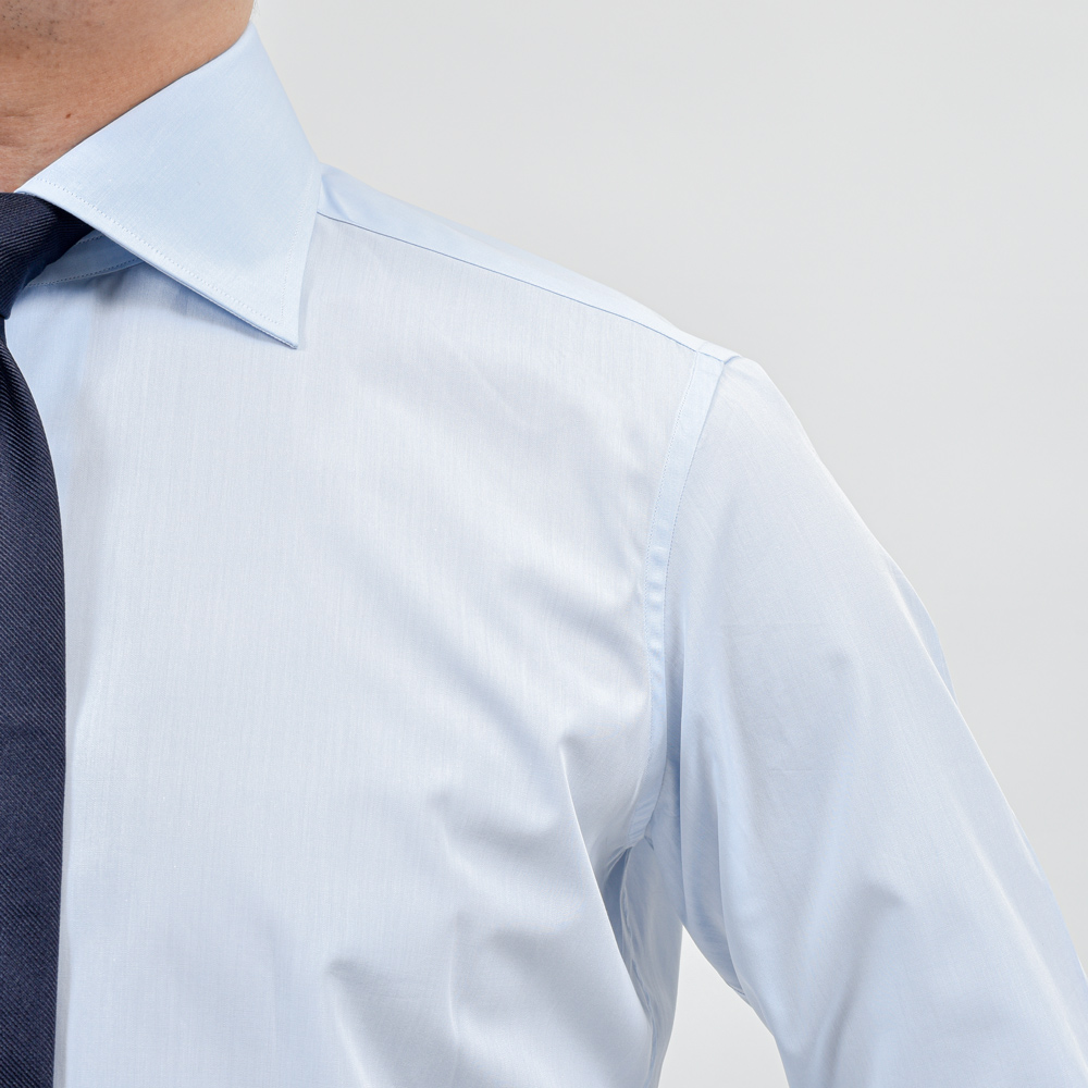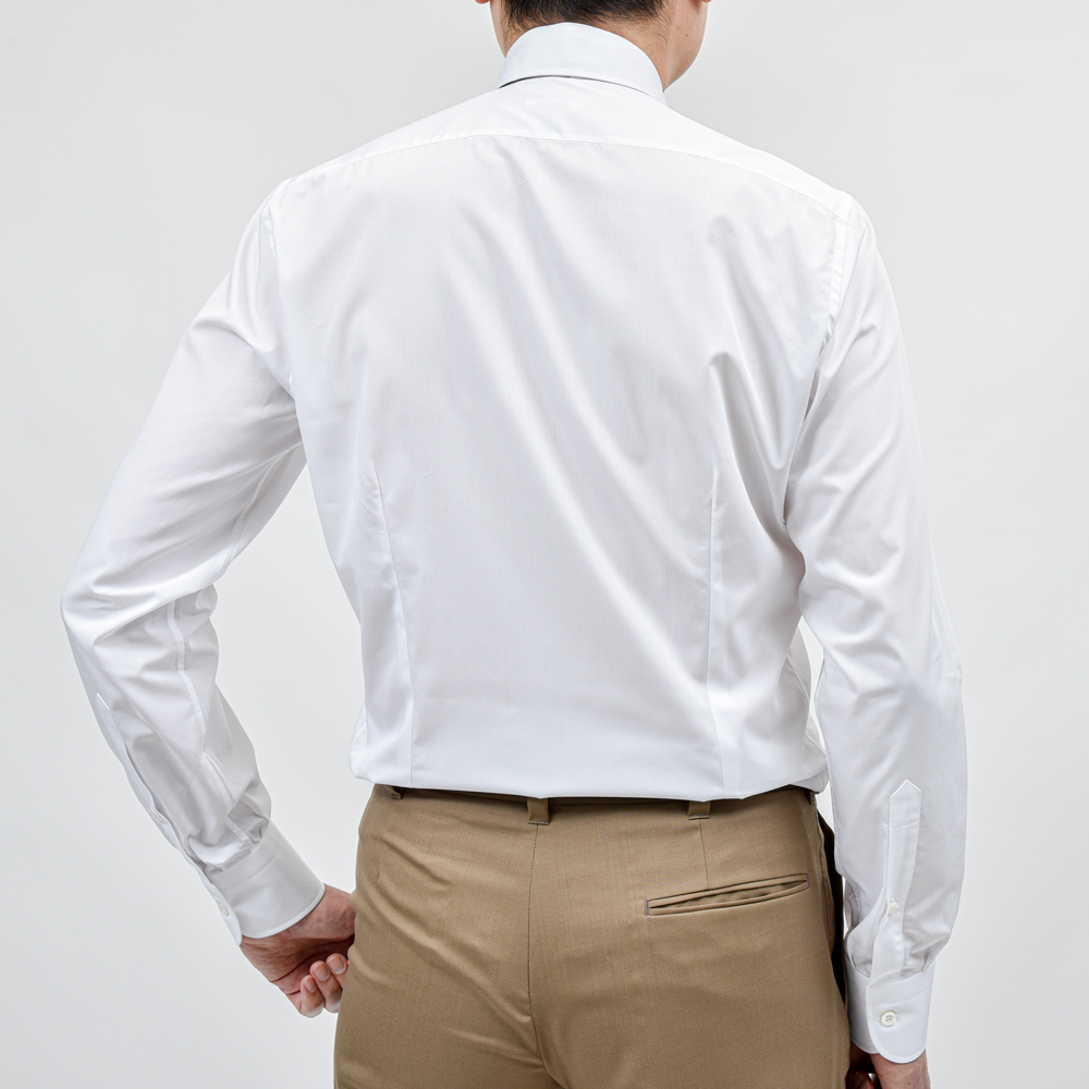 セミワイドカラーとベーシックな襟型ですが、襟羽がやや長くジャケットから抜けることなく綺麗に収まります。