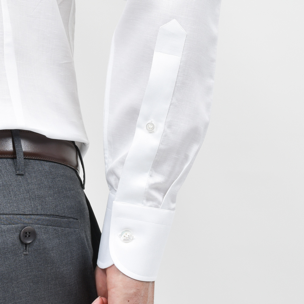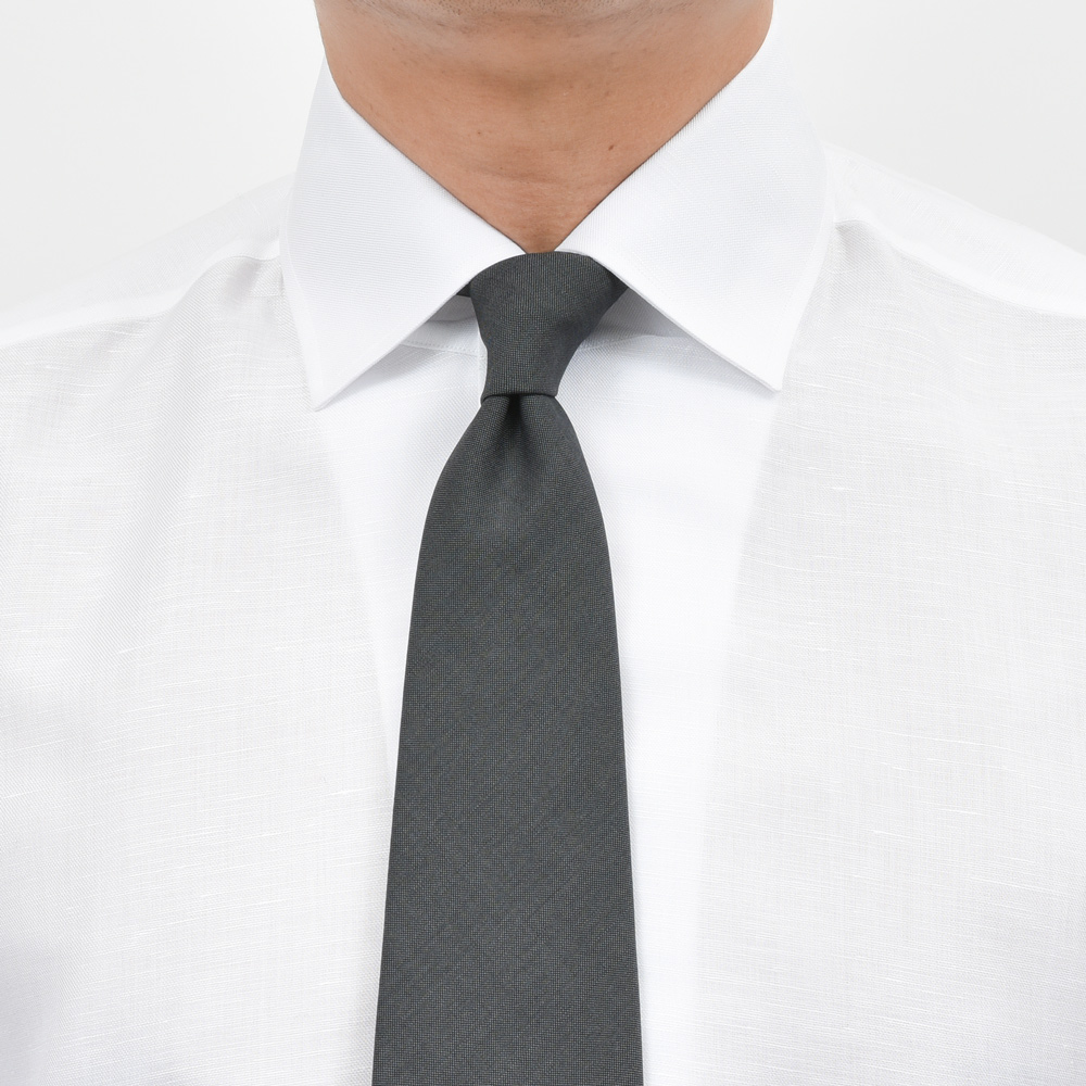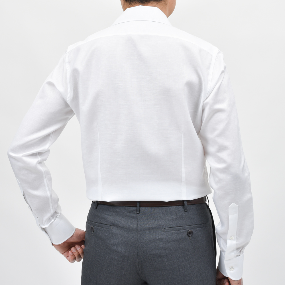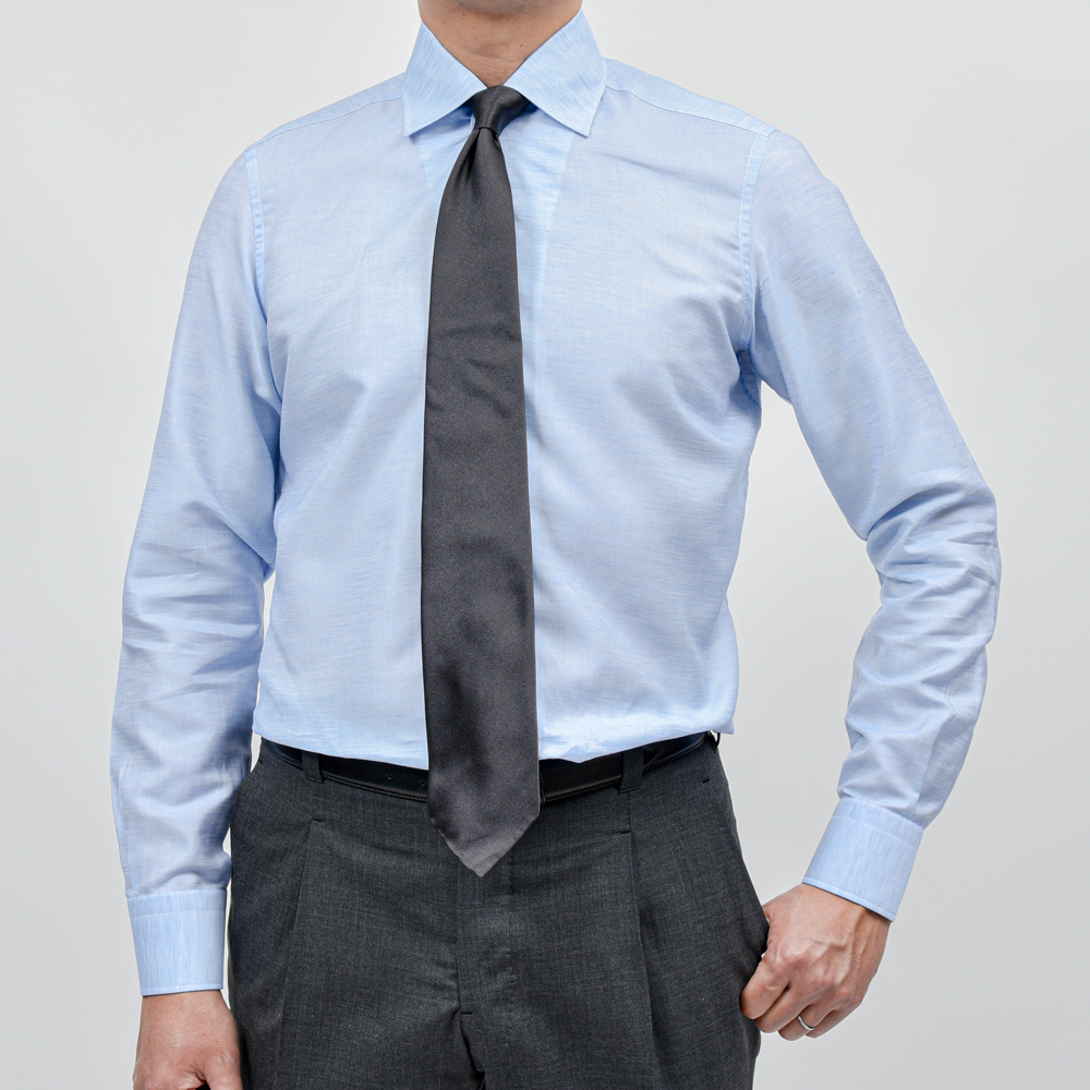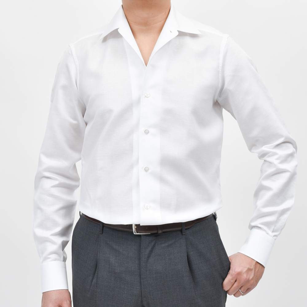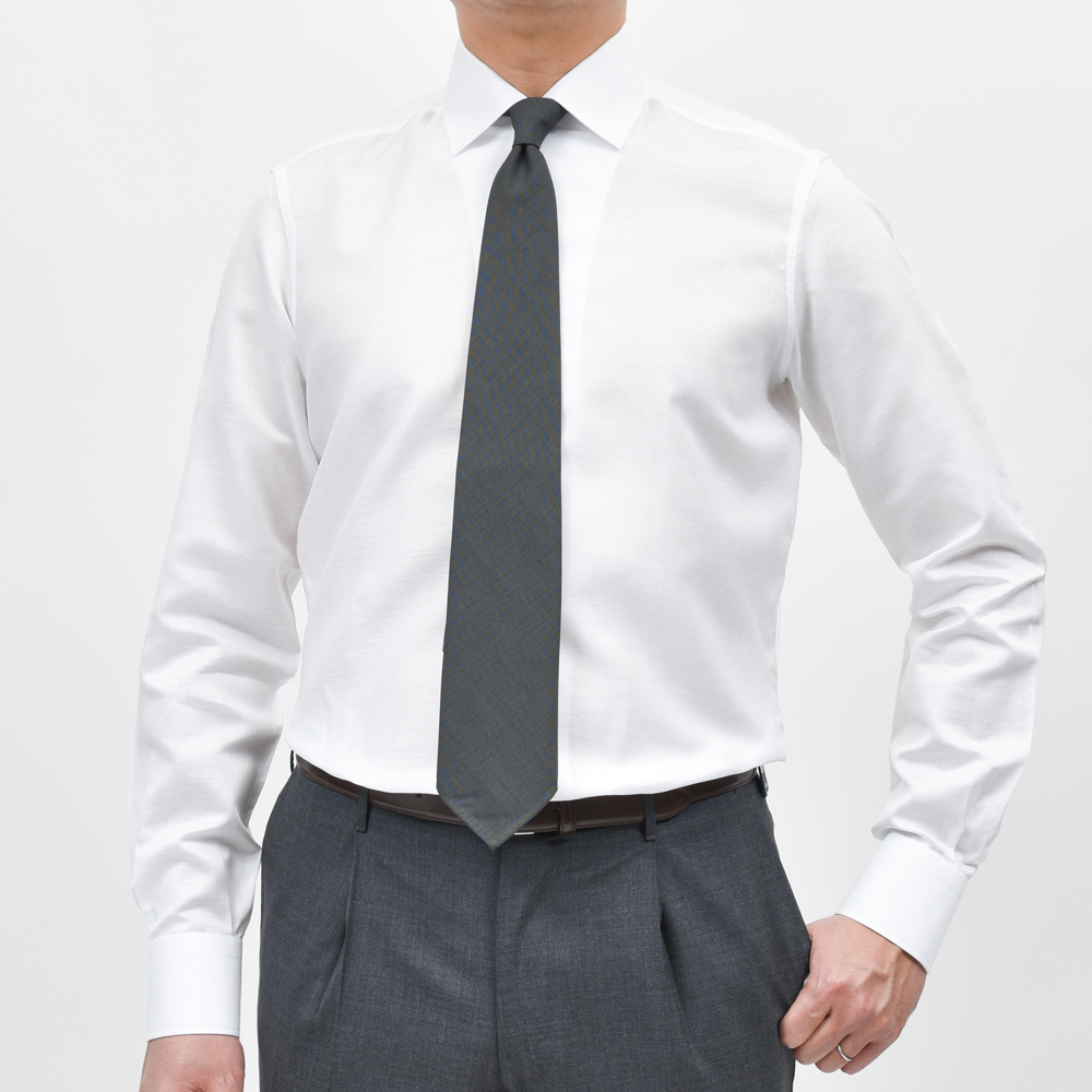 ネクタイをして良し、ノータイでも良しという2WAY使いを推奨しておりまして、どちらのスタイルでも非常に美しくエレガントな雰囲気を出せるシャツであることに変わりはありません。