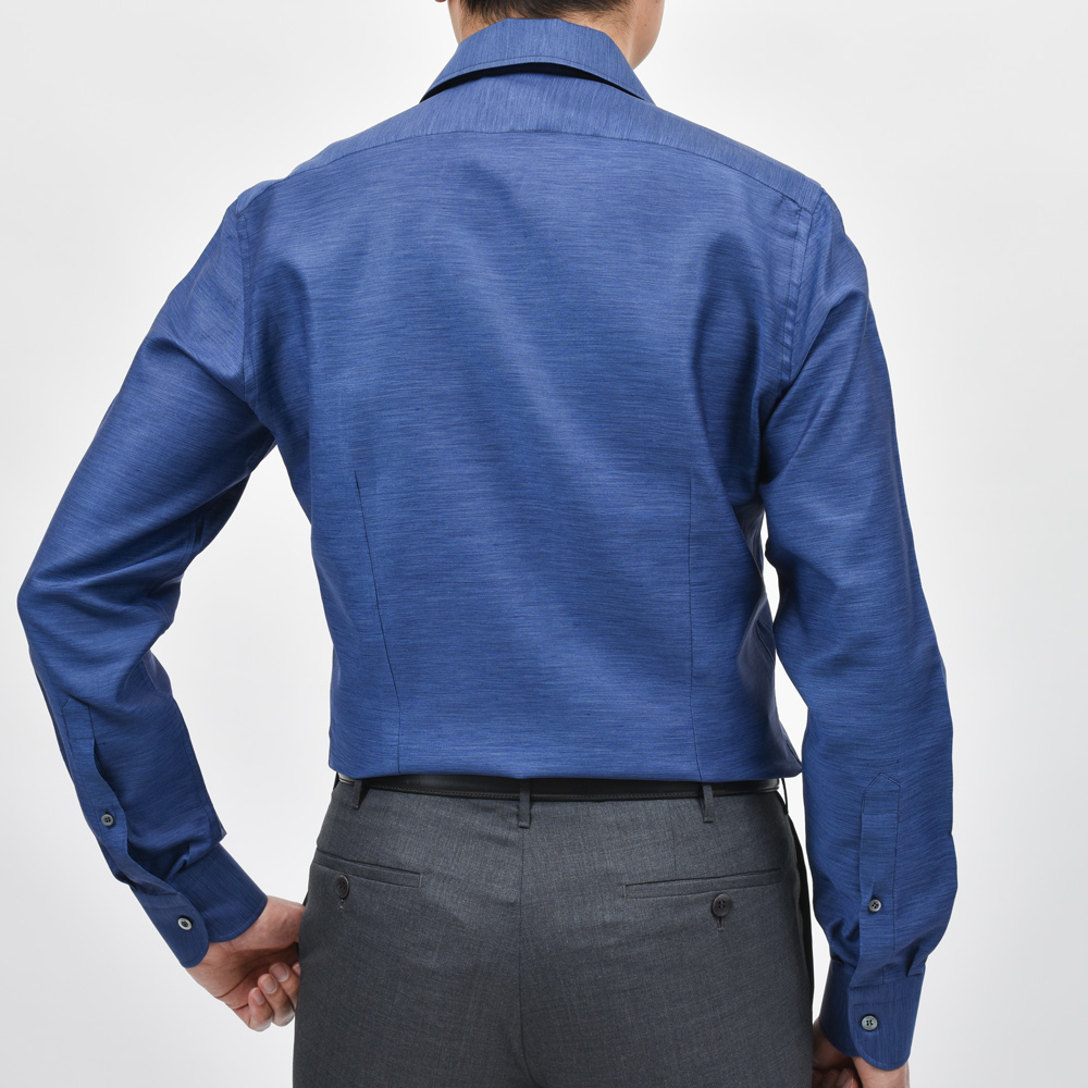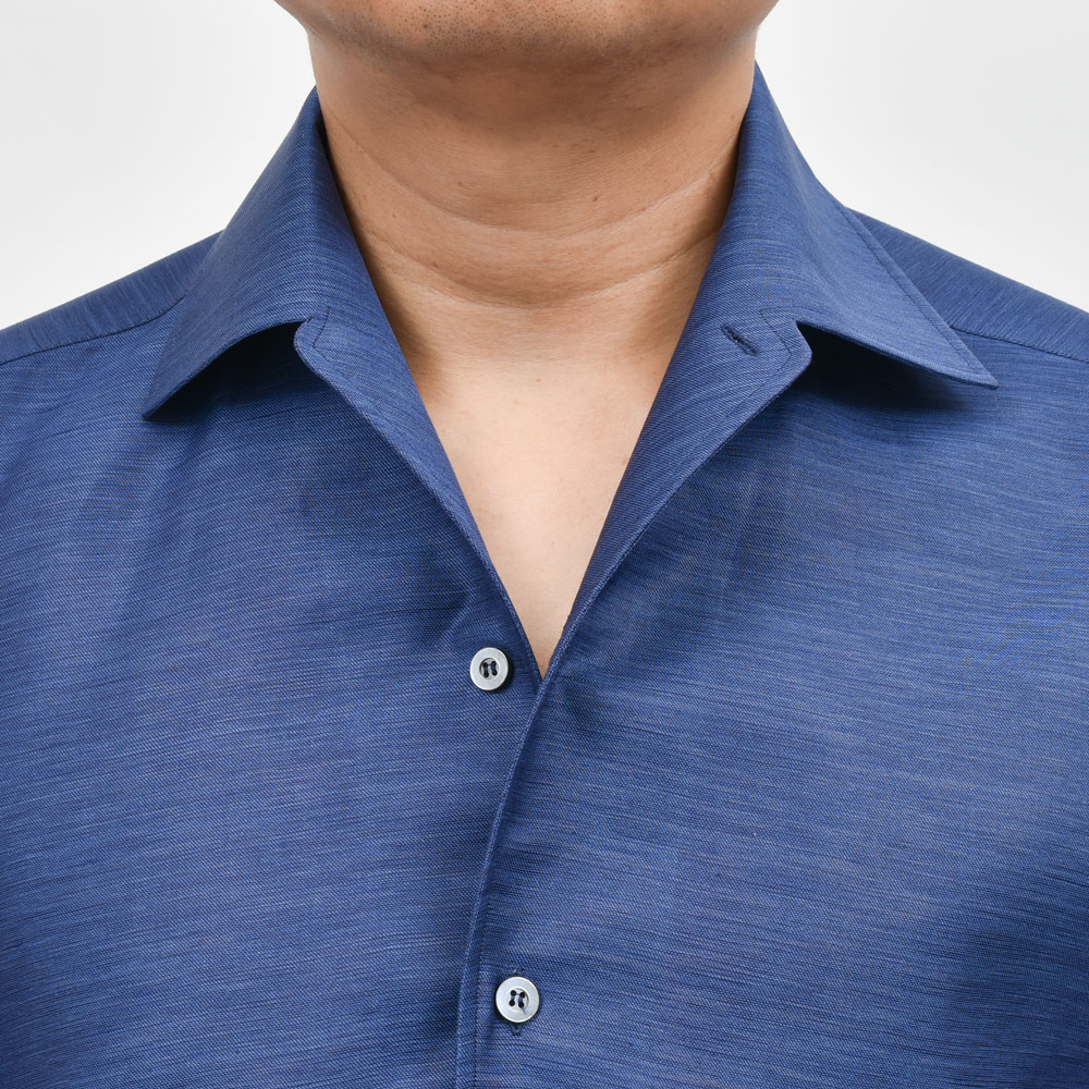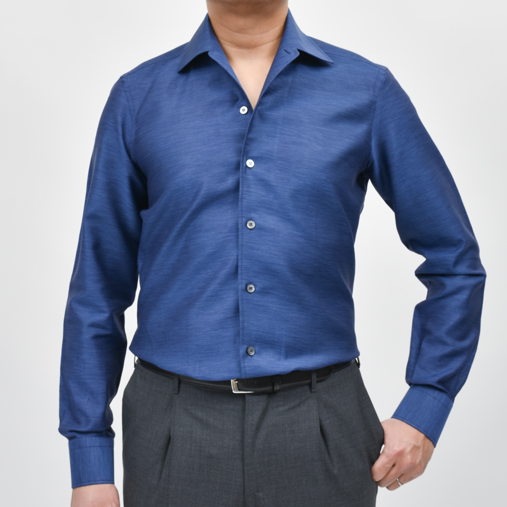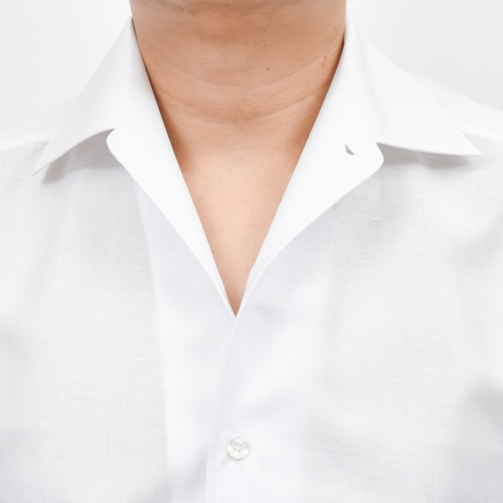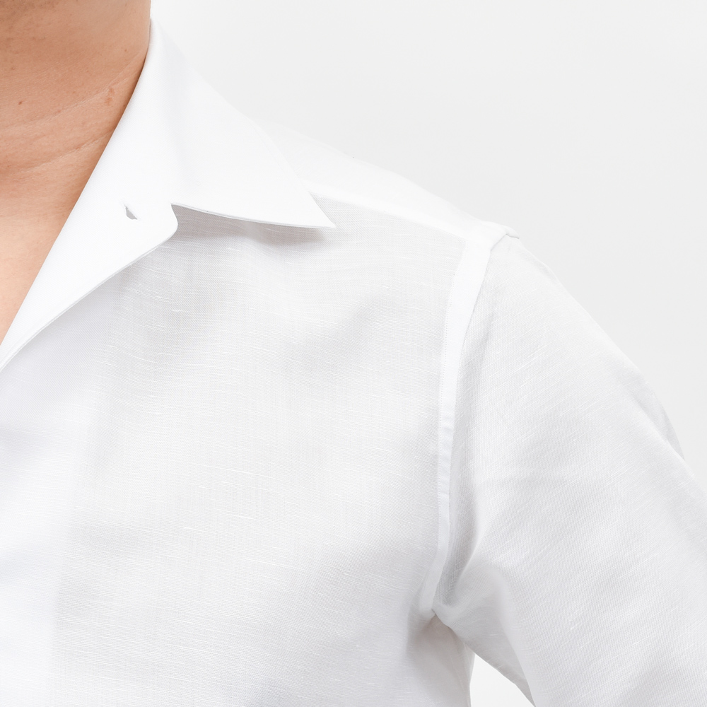 ノータイでもエレガントな印象を与え、ボタンを開けた時の襟は美しくなめらかに立ち上がり、軽やかで上品な印象になります。
