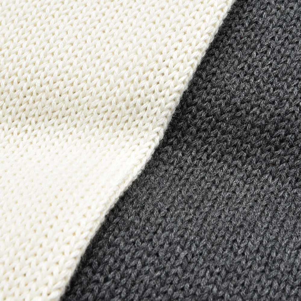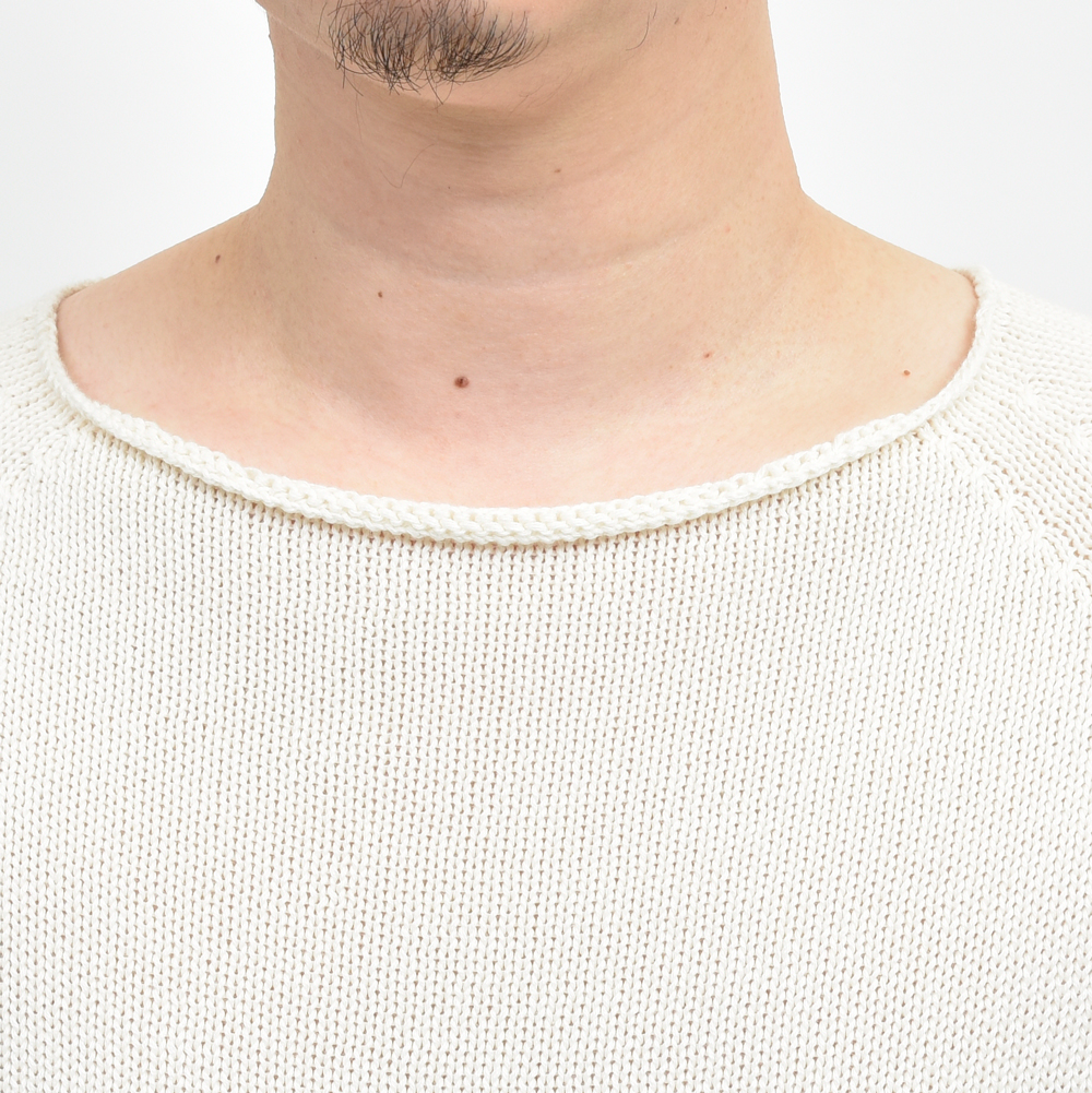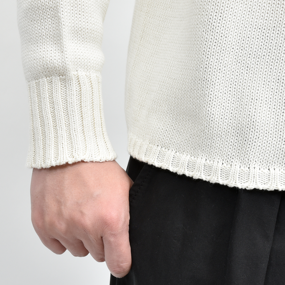 袖はしっかりとリブで絞り、裾はふわりとしたシルエットを崩さないよう絞りなし。ネックリブも付けずカットソーライクな軽さを出しながらしっかりニットという見事なバランスに仕上がっています。