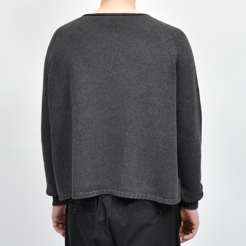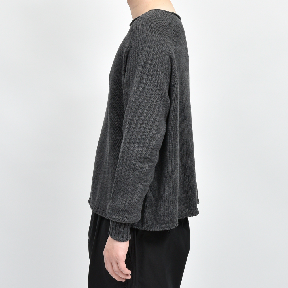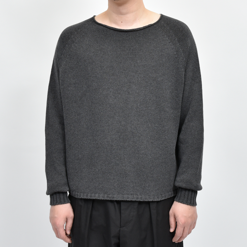 ma'ry'ya(マリア)らしいリラックス感のある一着でして、ボートネック、ラグランスリーブ、裾リブはコンパクト、シルエットはボックスを採用、ゆったりと見せつつも大き過ぎない塩梅が絶妙ですね。全体的に抜け感のあるタイプのニットになっています。