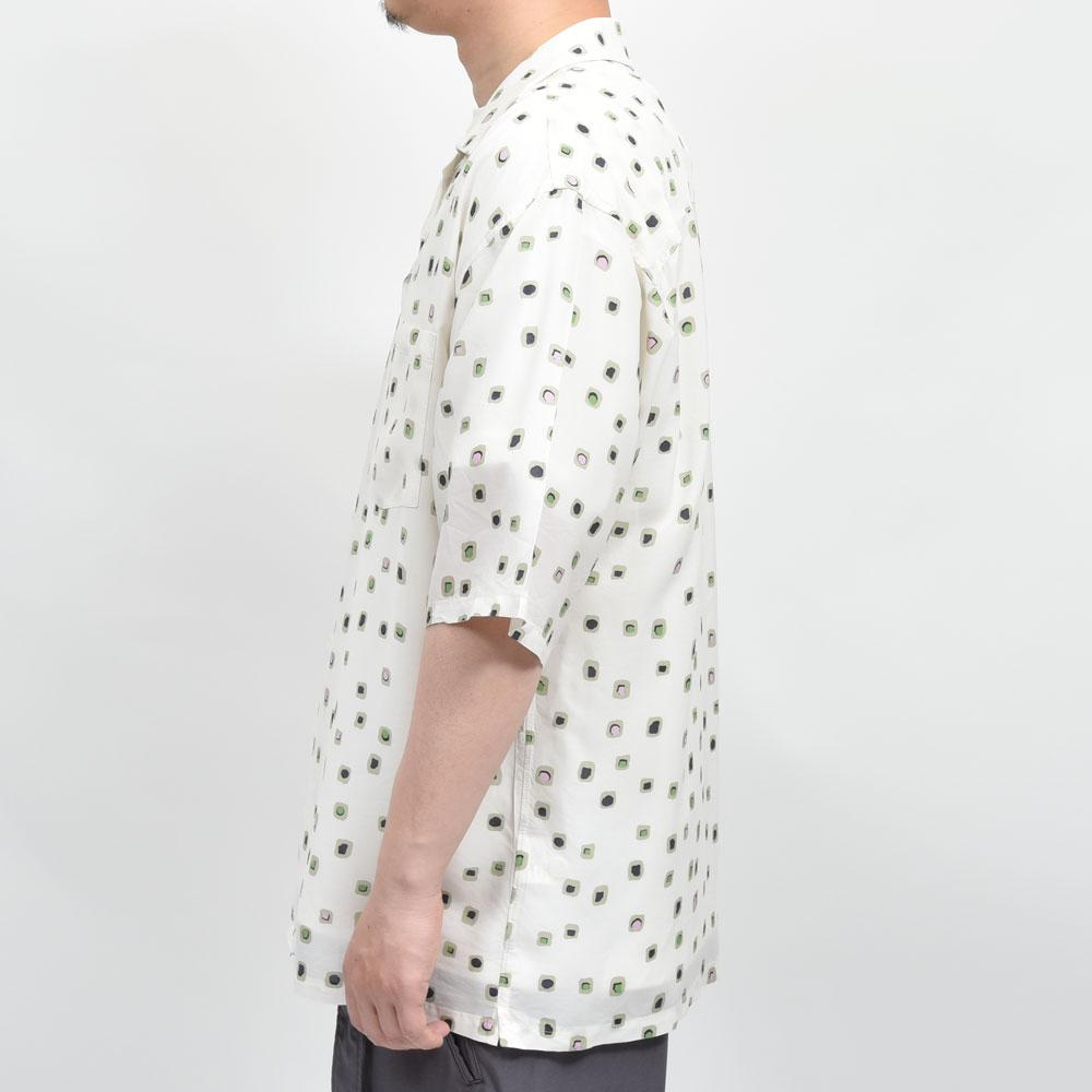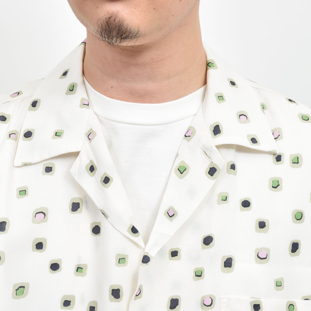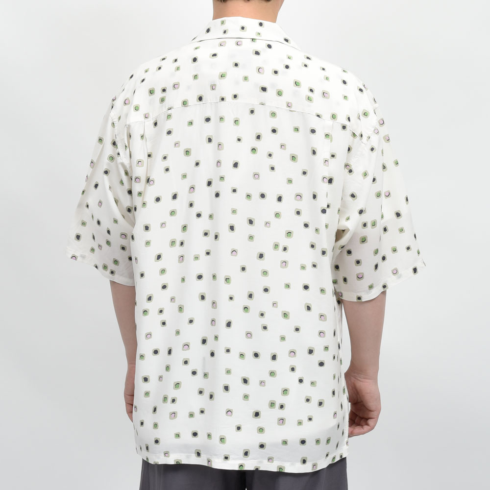 mando(マンド)のサマーシーズンといえば柄物の半袖シャツです、これはもう外すことができない風物詩的な存在です。キュプラレーヨンを採用したとろみのある生地に、ヴィンテージライクなスクエアプリントを散りばめたような一着。