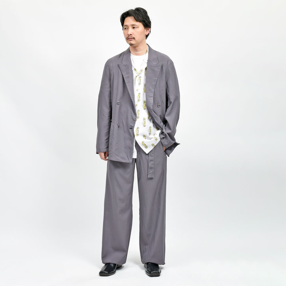 ジャケット単体でも活躍してくれますが、せっかくなのでセットアップで着用してほしい、、、!!という思いがあります、特に今回はパンツの方に共生地のベルトが付くのでよりファッションとしての面白みを感じてもらえるはずです。