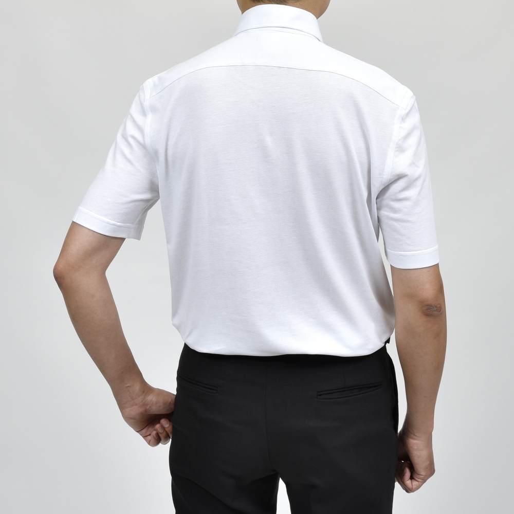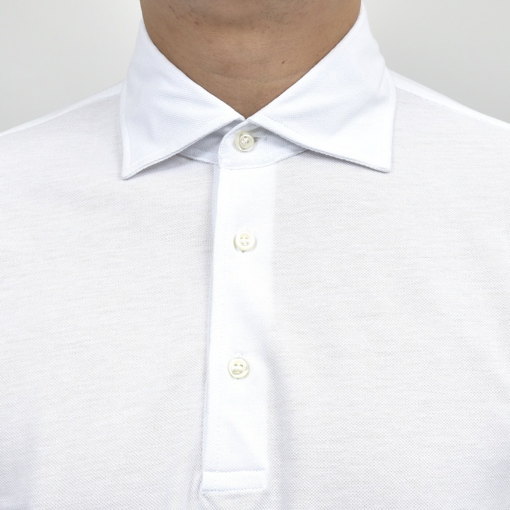 襟元はドレスシャツのようにしっかりと構築され、ゴルフ場での品格も忘れません。