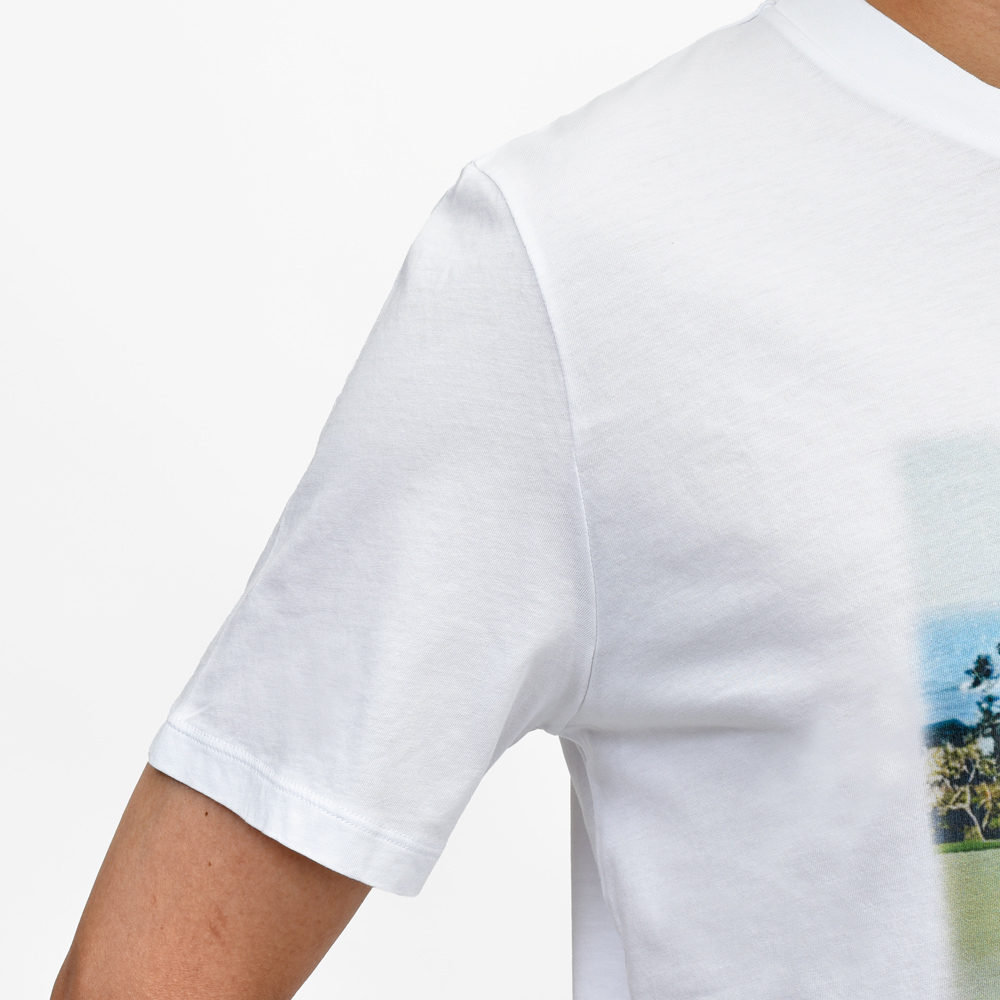こちらはゴルフをメインとした1着で海が見える緑豊かなゴルフ場を背景にゴルフバッグを積んだカートがプリントされています。カジュアルながらも上品さを感じさせる完成度の高さです。