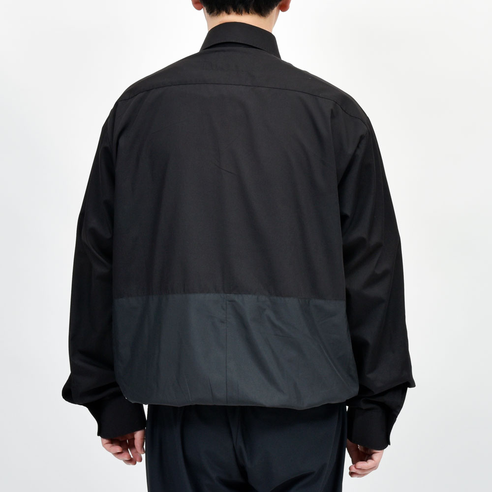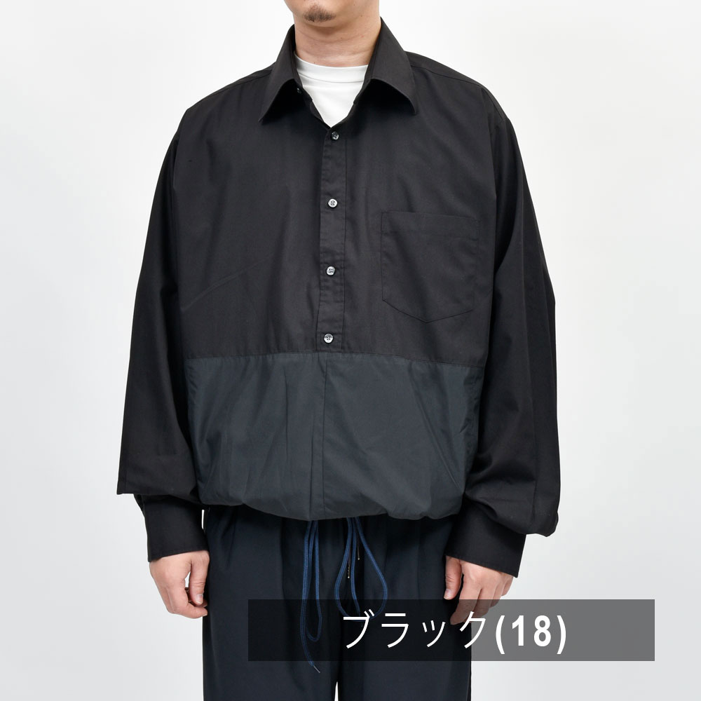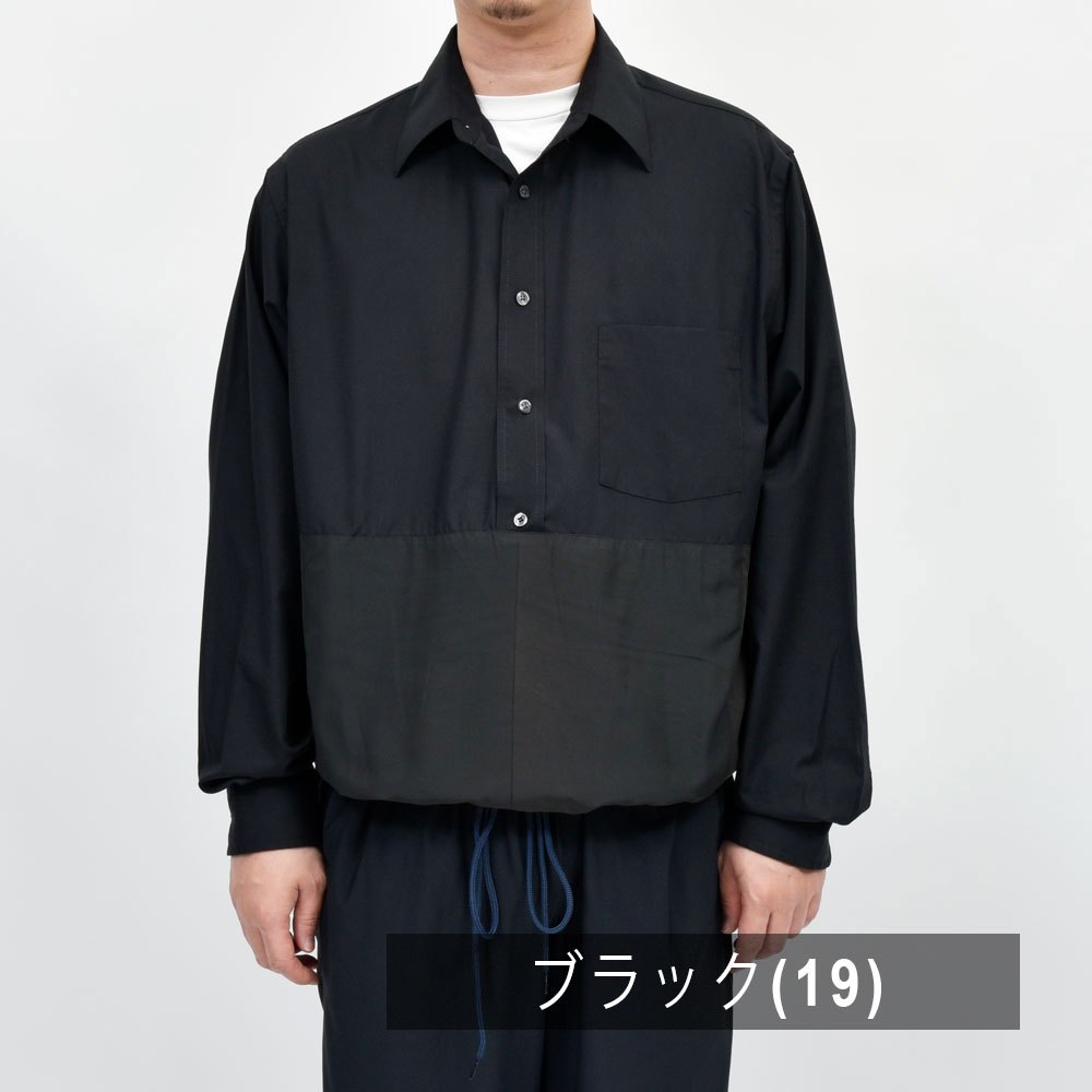 こちらのプルオーバーシャツ、身頃の上下で切り替えを行い裾はゴムシャーリングの仕様になっているデザインの効いた一着。バランスはゆったりとしたオーバーフィット、リメイクアイテムでありながらもそのシルエットのモダンさは流石です。
