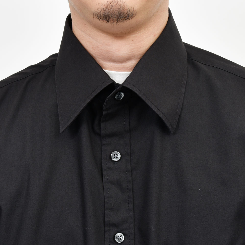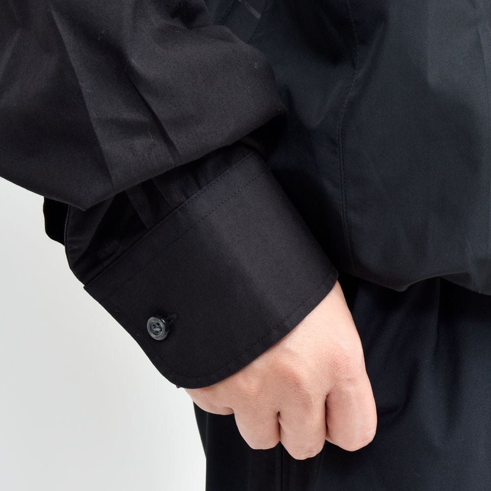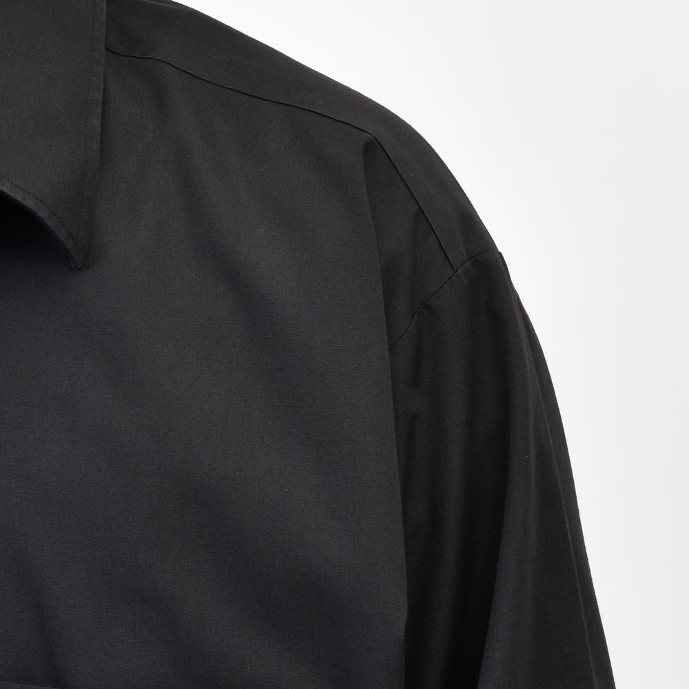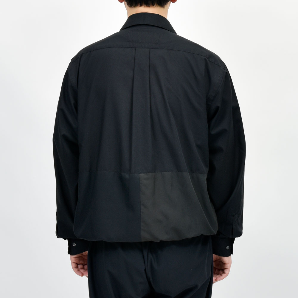 こちらのプルオーバーシャツ、身頃の上下で切り替えを行い裾はゴムシャーリングの仕様になっているデザインの効いた一着。バランスはゆったりとしたオーバーフィット、リメイクアイテムでありながらもそのシルエットのモダンさは流石です。