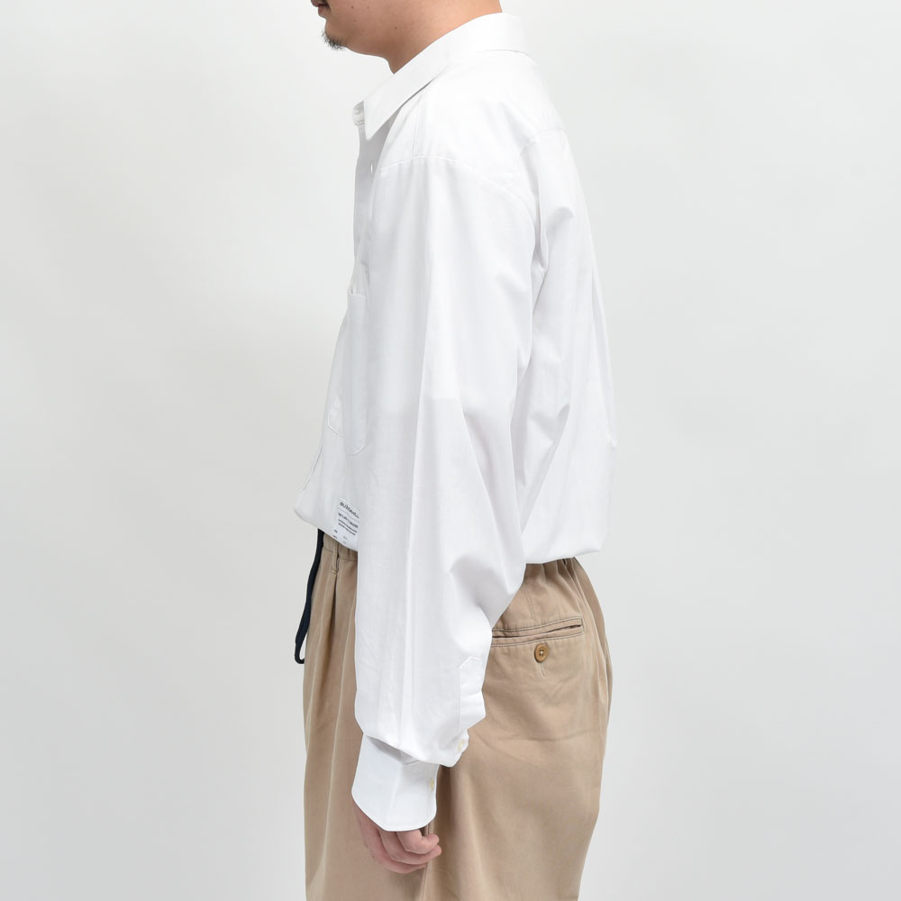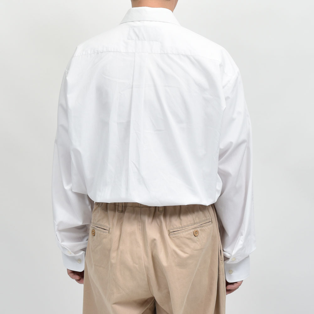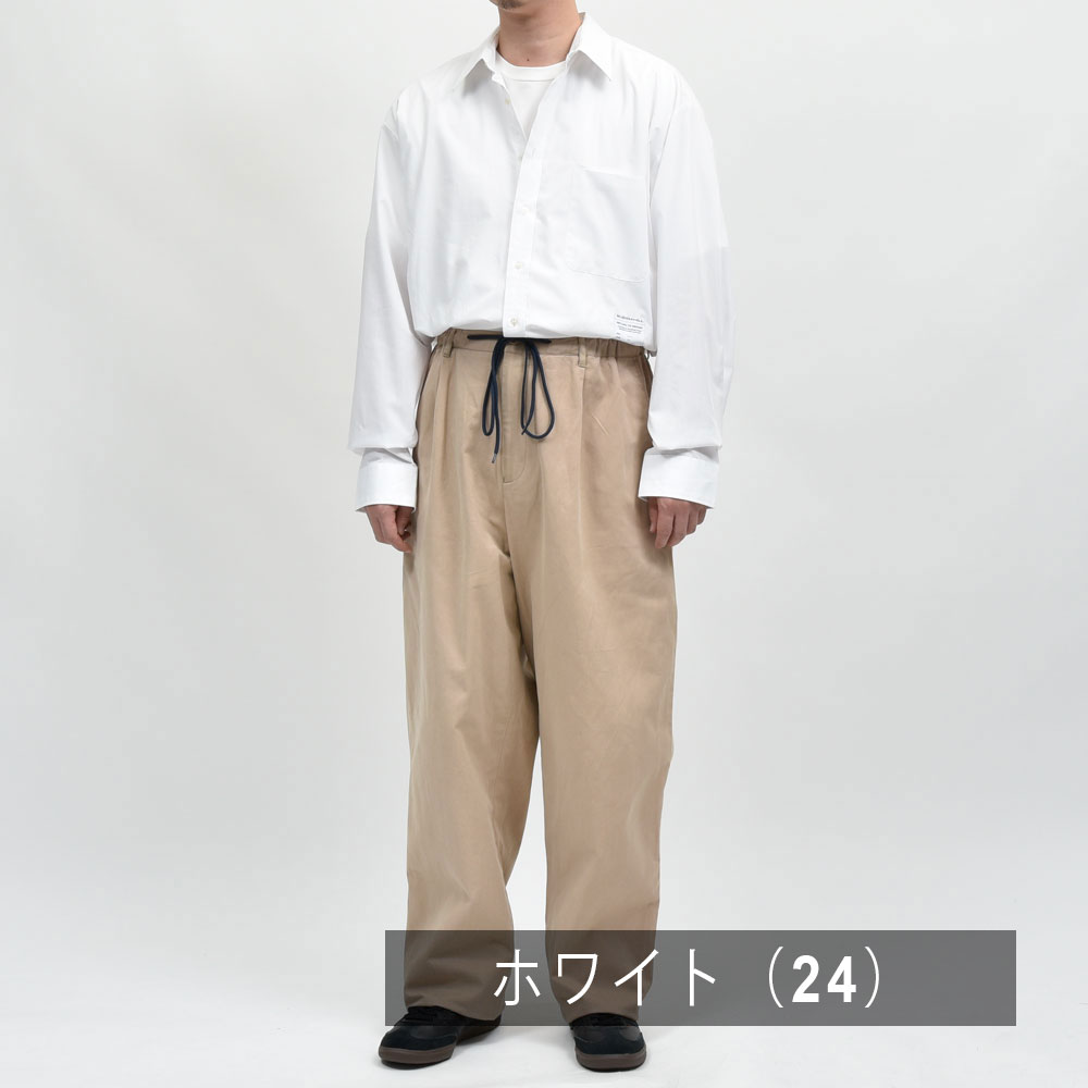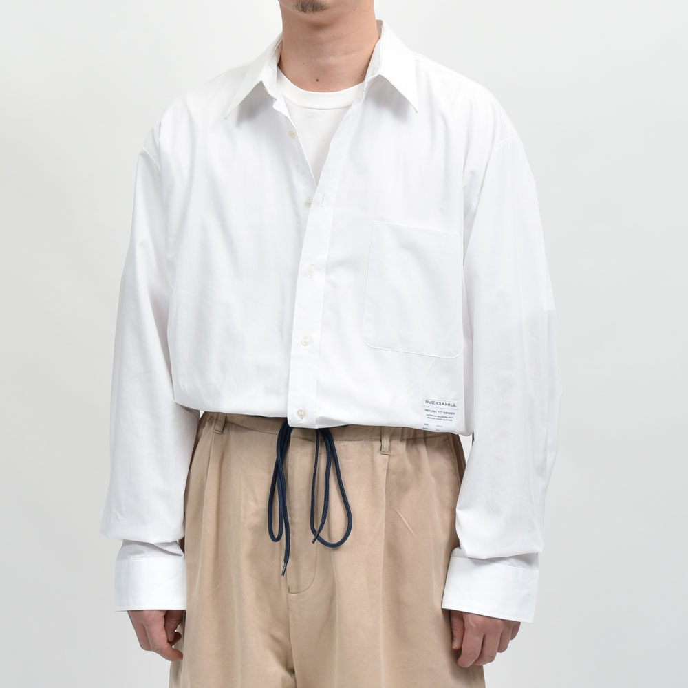 シャツはホワイト、パンツはベージュ、ベーシックな合わせではありますがそれをBUZIGAHILL(ブジガヒル)のフィルターを通して再構築した一着は非常にファッションレベルの高い一着になっています。