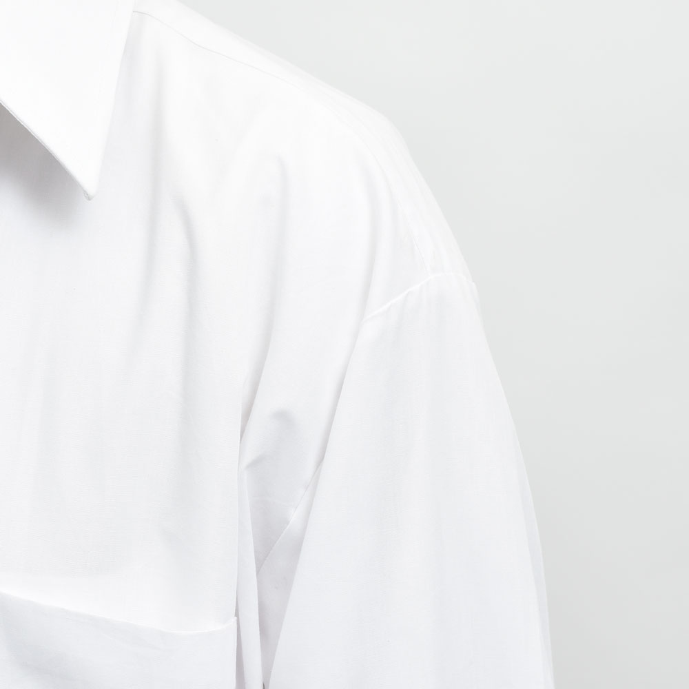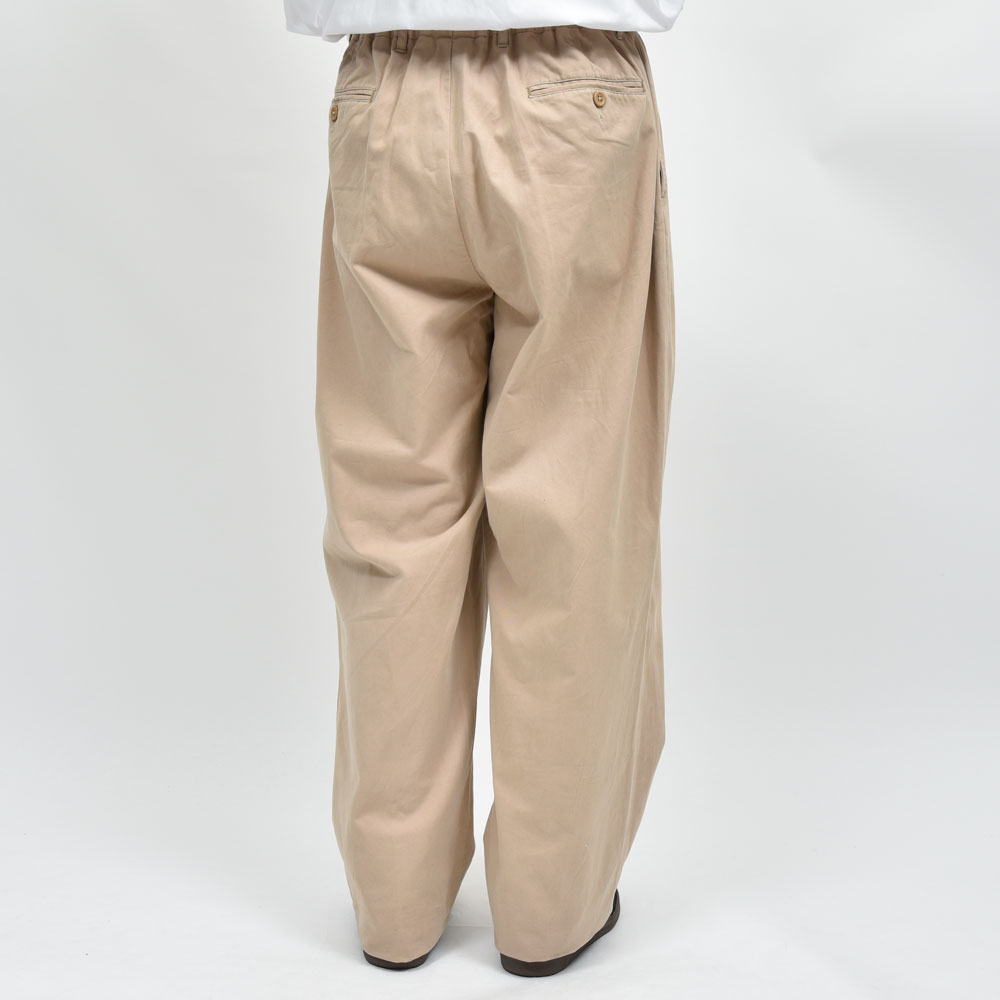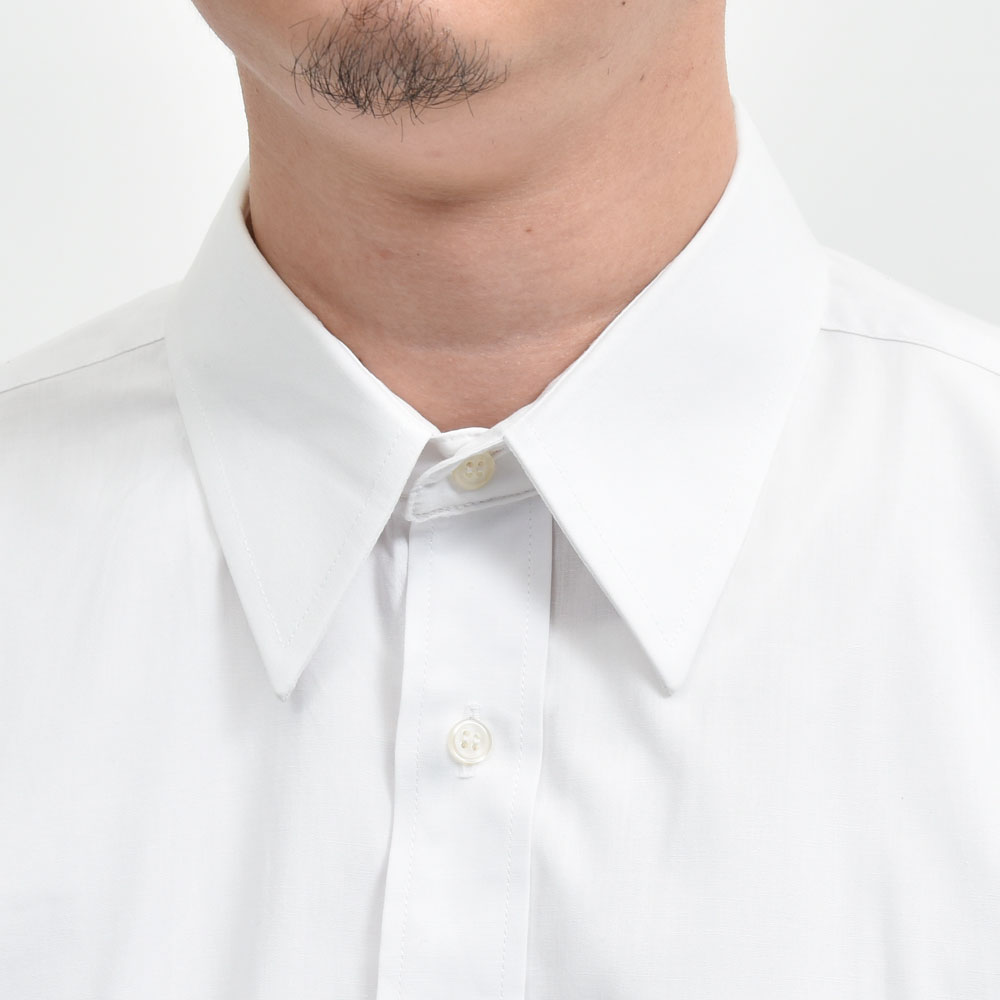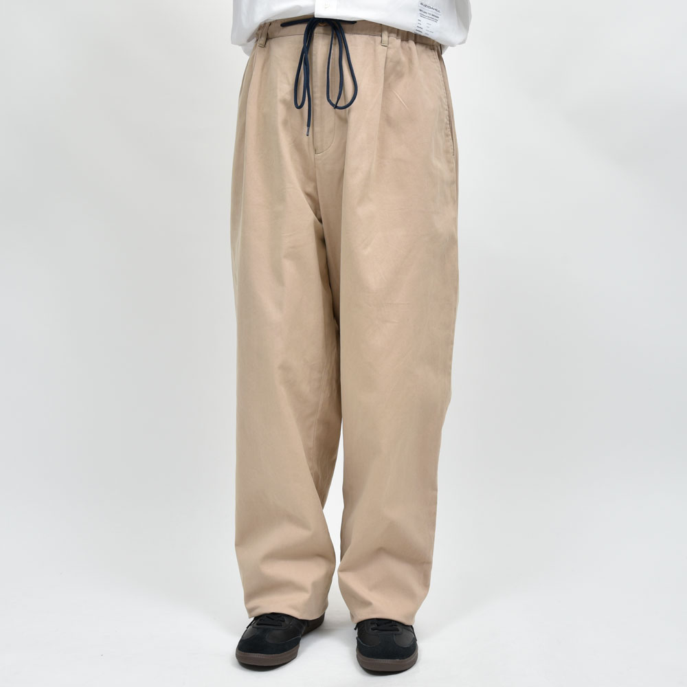 シャツはホワイト、パンツはベージュ、ベーシックな合わせではありますがそれをBUZIGAHILL(ブジガヒル)のフィルターを通して再構築した一着は非常にファッションレベルの高い一着になっています。