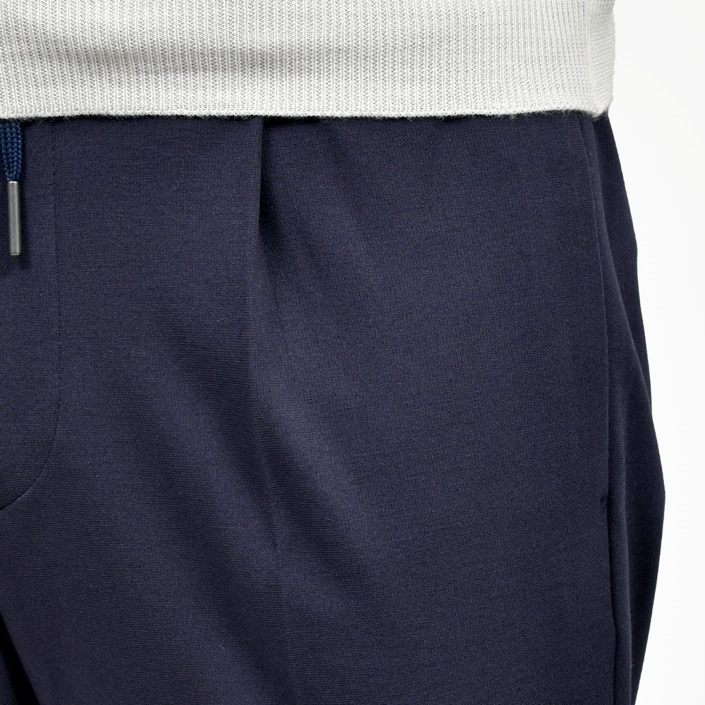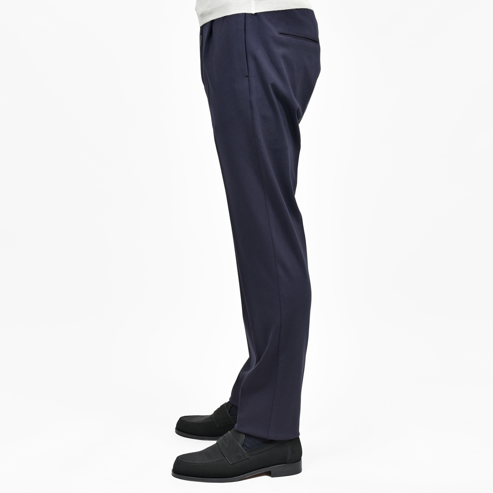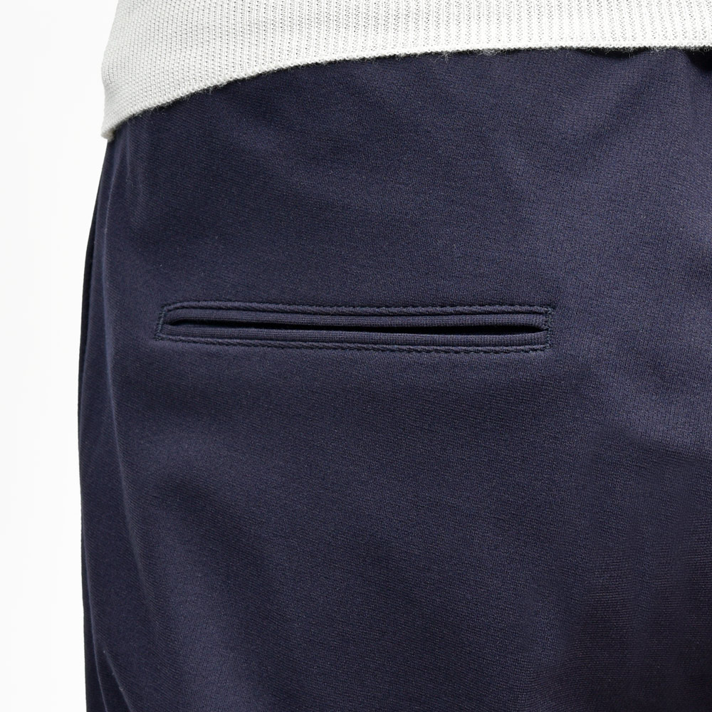 もちろん梳毛ウールほどエレガントというタイプではありませんが、ウエストシャーリングとはいえベルトをすると程近いクリーンさが出せますので、ジャージ生地のパンツとしてはとても美しい仕上がりです。