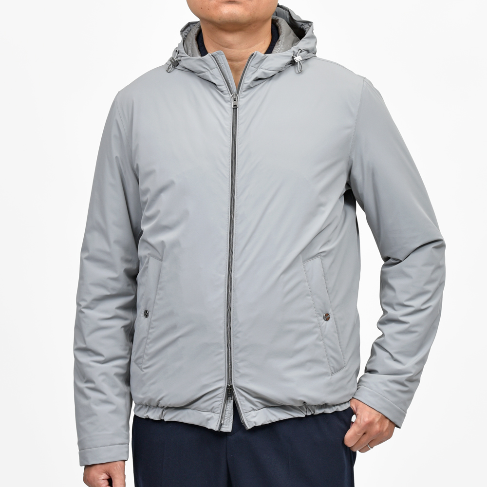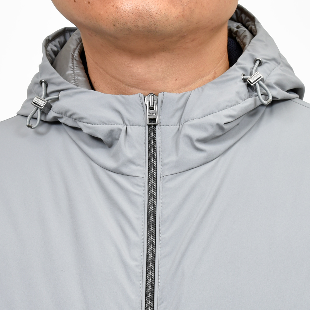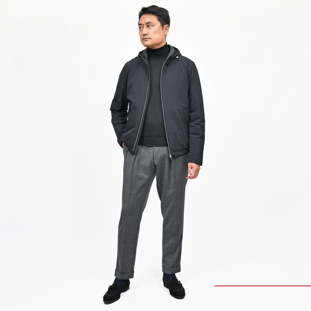 シンプルなジップフーディーは素材や金具など付属のクオリティがストレートに出てきますので、上品に見せるには上質な物を選ぶことが必須ですね。とはいえただ生地が高い物を選ぶと品良く見えるかというとそうではなく、全体のバランスが控えめに整っているかも重要。その点HERNOは申し分のない仕上がりになっています。