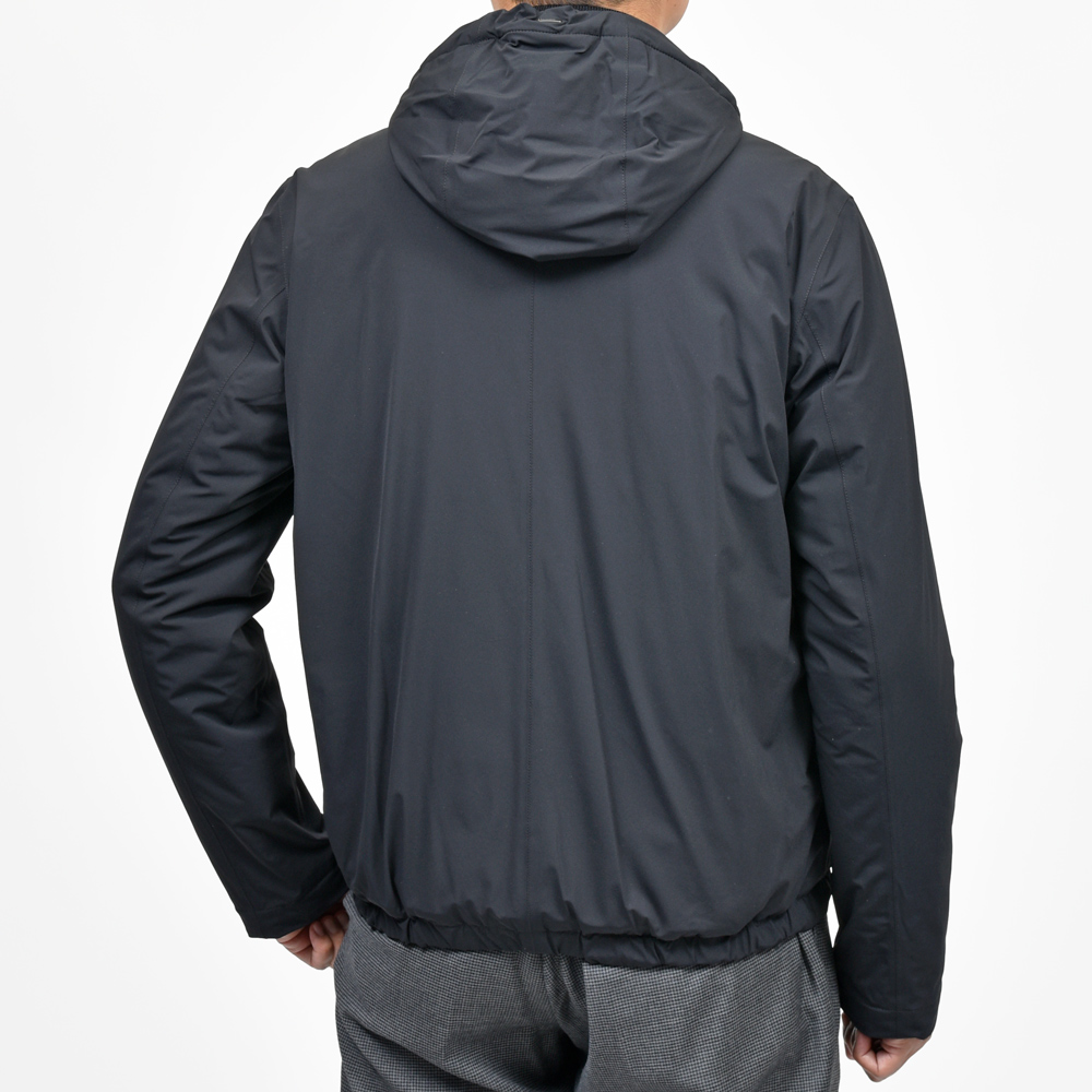 ベーシックなフーディーブルゾンは薄っすら中綿入りのパッカブル仕様。