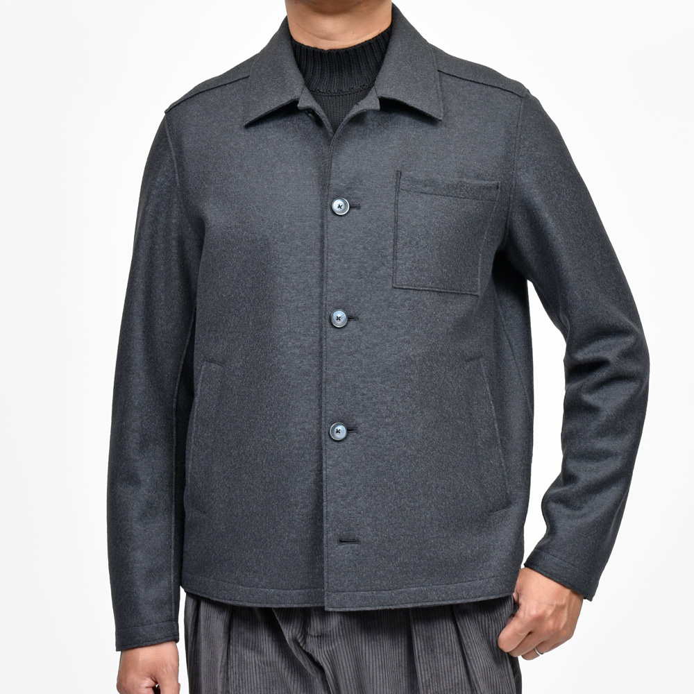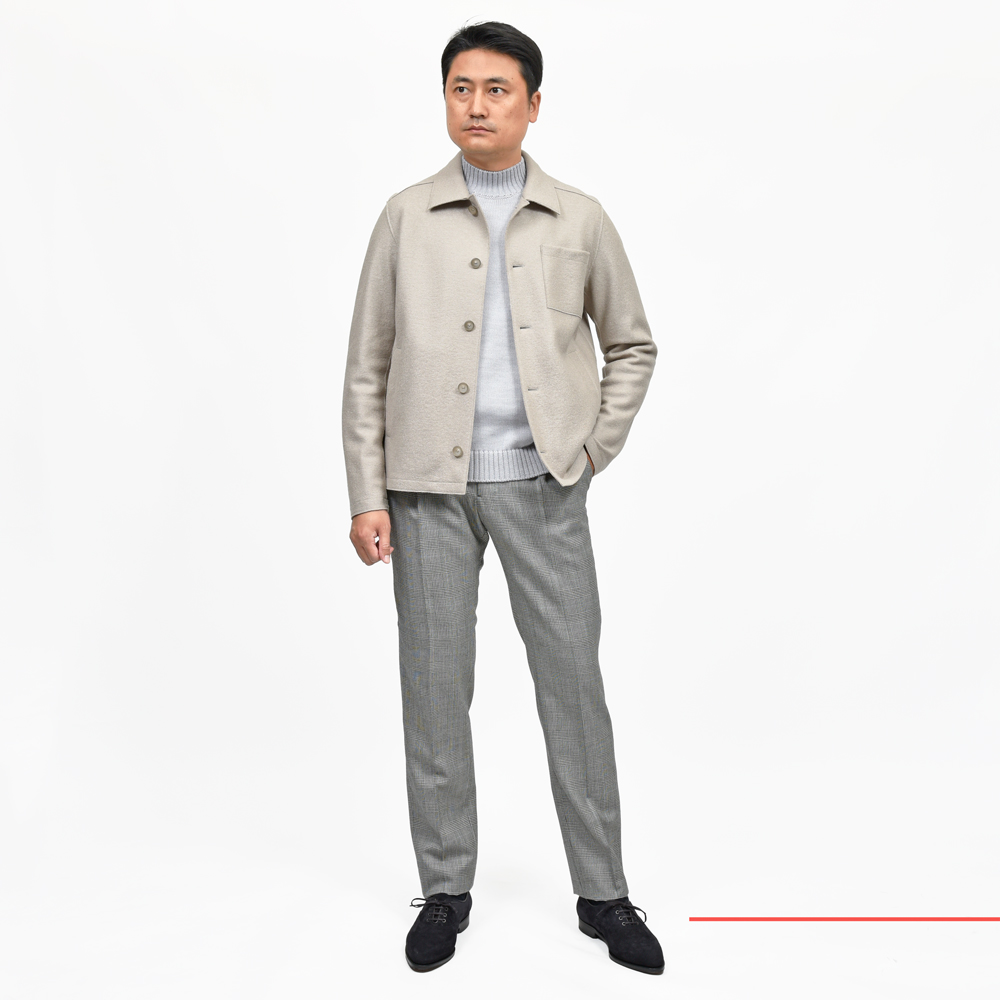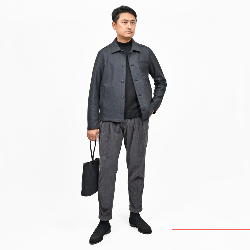 品よくシンプルで上質に、このバランスの取り方の上手さはHERNOならではという感じですね。シャツブルゾンなので気軽に取り入れることができますし、ジャケットスタイルと差別化を図ることができます。