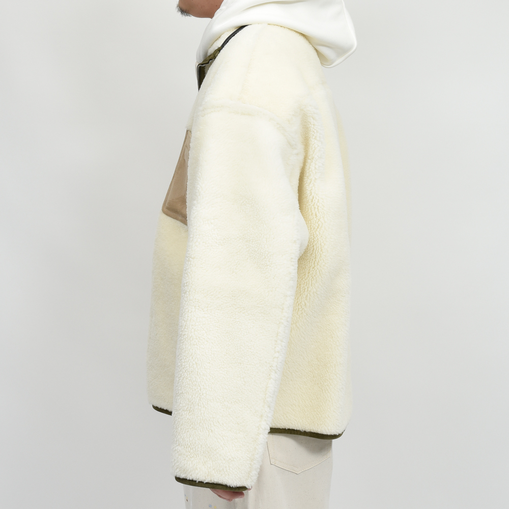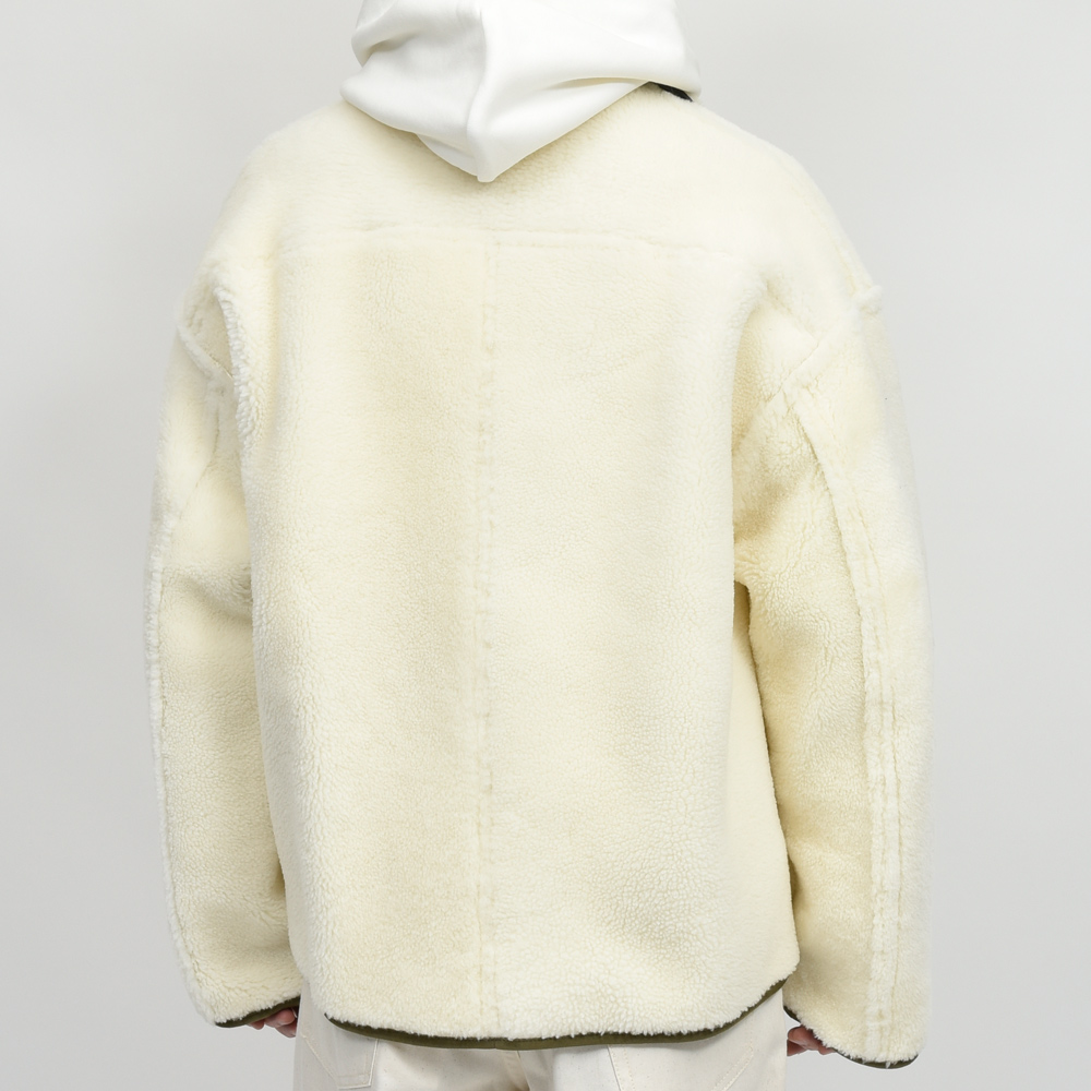 アウトドアブルゾンといいますかフリースといいますか、そんな感じのデザインですが素材はリアルなムートンです。肩の落ち感やアームのシルエットがとても現代的ですね。