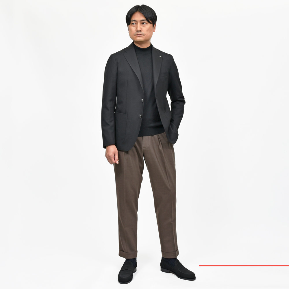 クラシックをベースにしながらモダンに見えるバランスの2B仕様を採用し、ウエストシェイプやレングスのバランスを整え、肩線を後ろに倒すことでブランドのアイデンティティを表現しています。