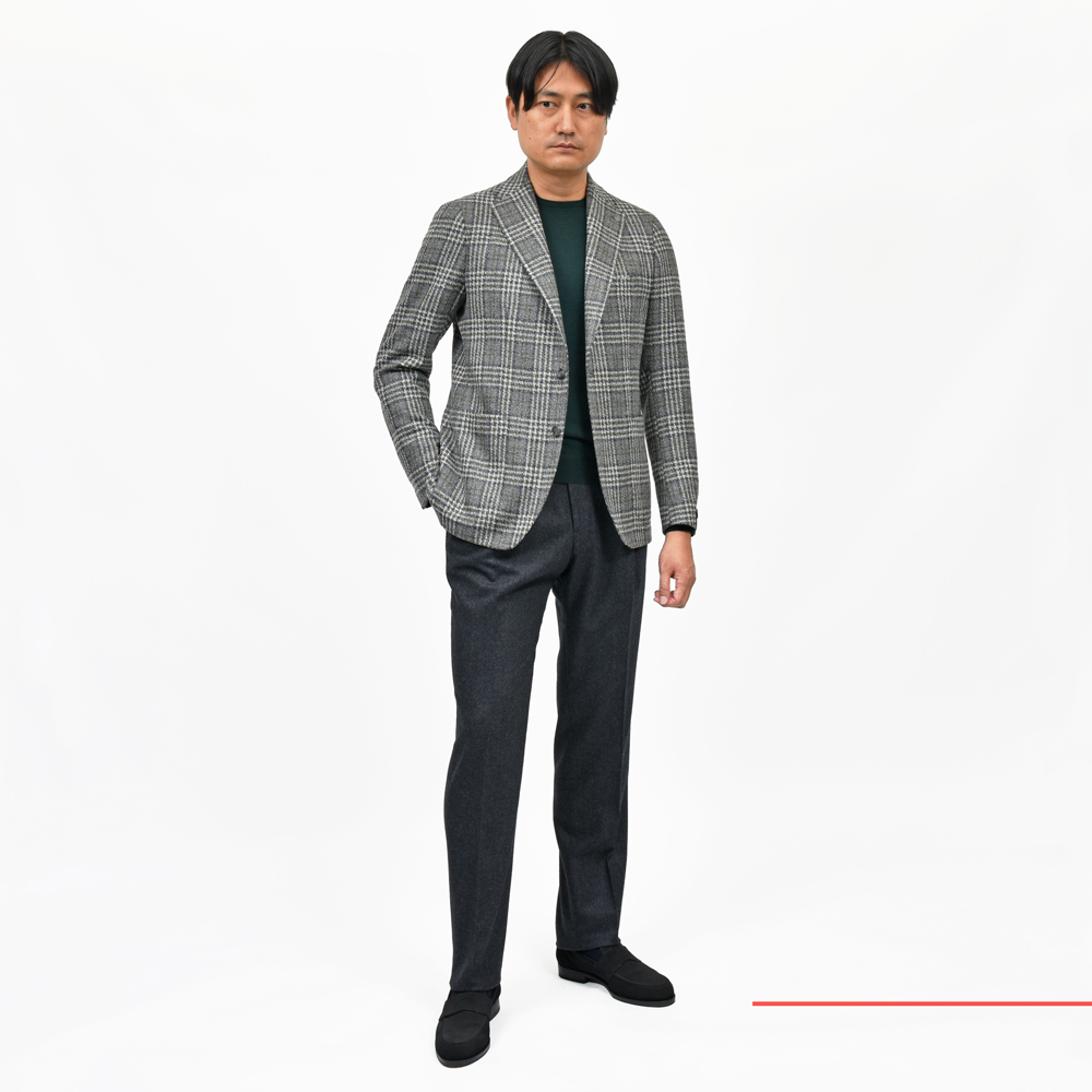 モスグリーンを効かせた少しトリッキーな配色ですが、グレーとの馴染みが非常に良く、英国的なイメージをグッとイタリアに寄せることで軽やかさと色気が効果的に表現されています。