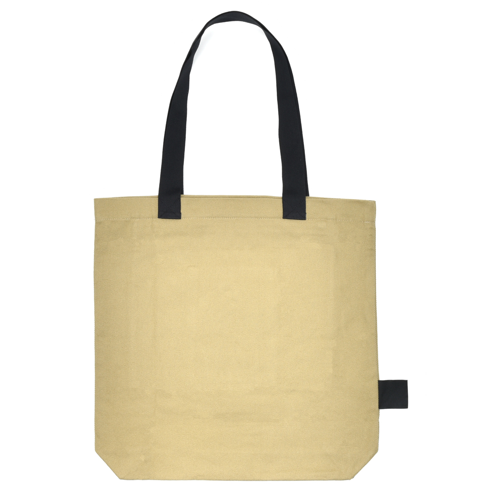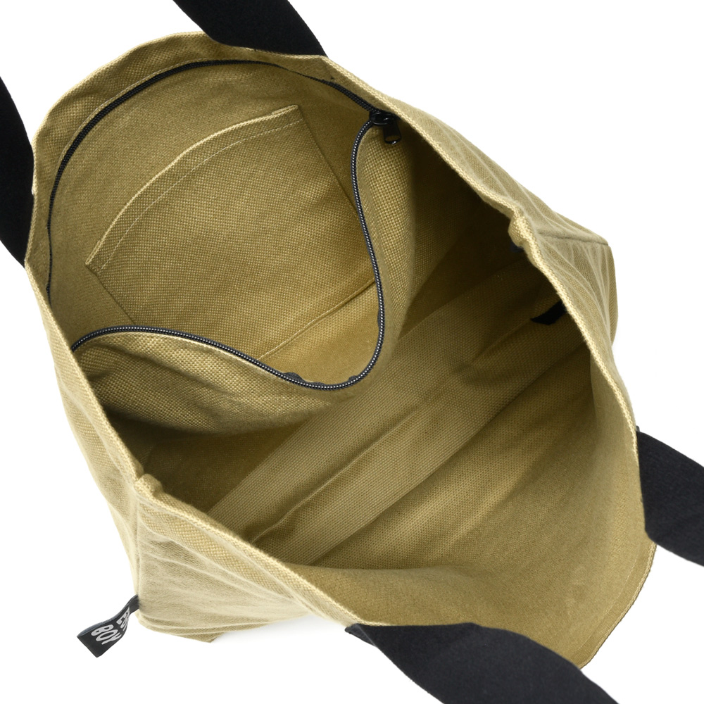 しっかりとしたコットンの生地を採用したスクエア型のトートバッグ、所謂ショッピングバッグ的なシルエットになっていまして、ハンドルは肩からかける為に長めに設定されています。また、内側にはジップポケットも装備しているのもポイント。そしてトッピングとしてやや大きめのEGYBOY(エギーボーイ)タグ、こういったところにも彼らの愛嬌を感じさせますね。