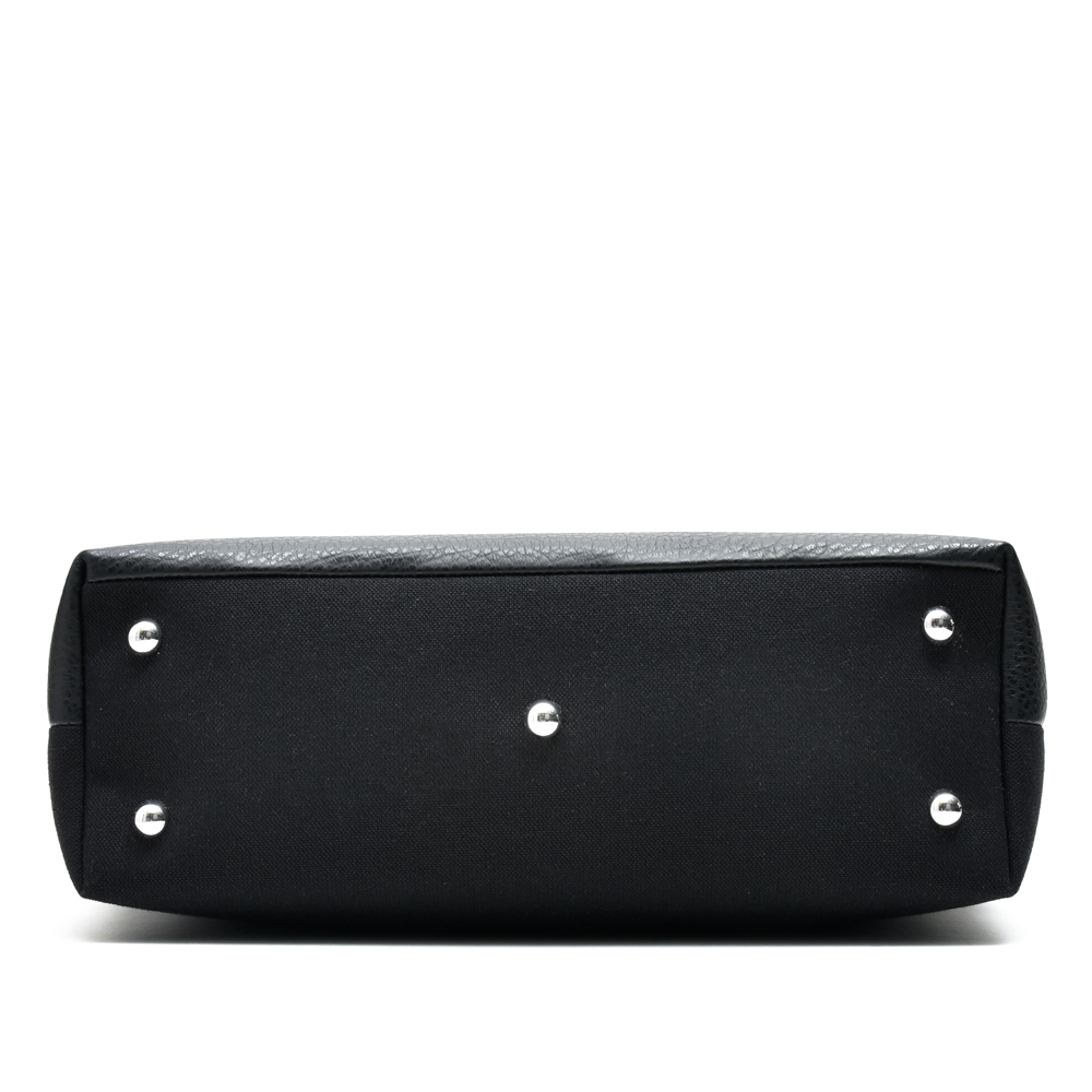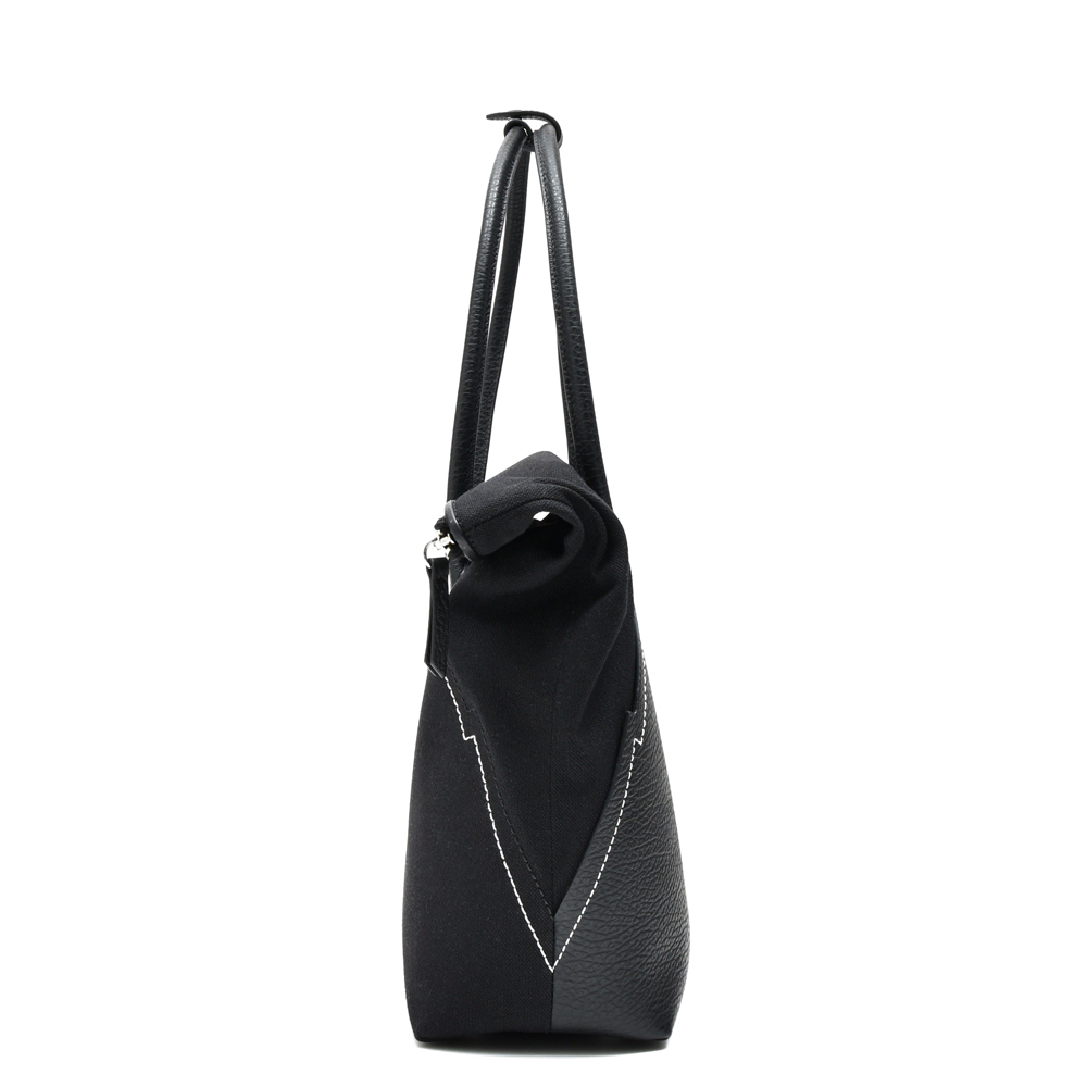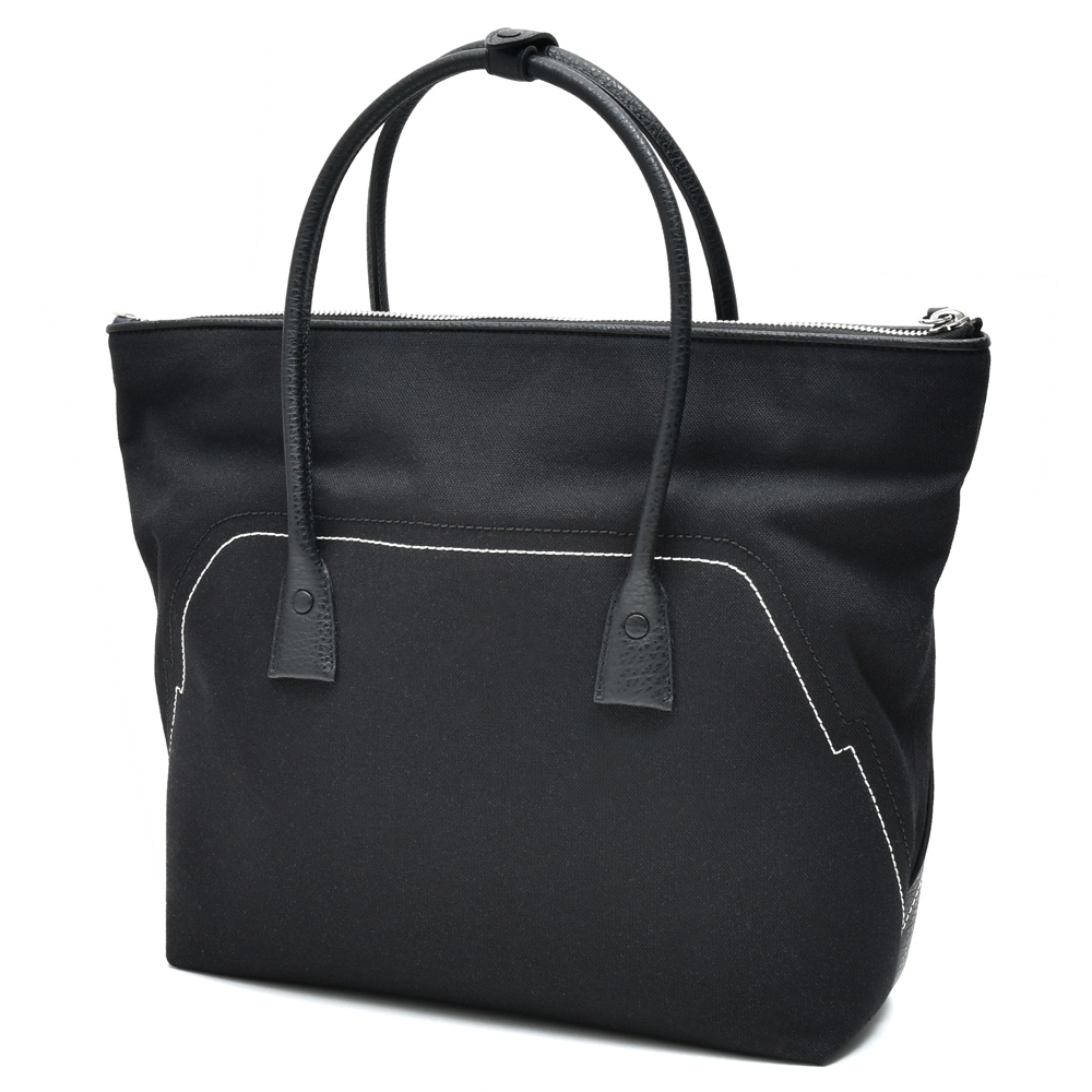 ブラックでまとめられたシンプルなトートバッグ型の逸品ですが、キャンバス部分を折り曲げて持つも良し、荷物が多ければ伸ばしても良しな可変型のバッグになっています。