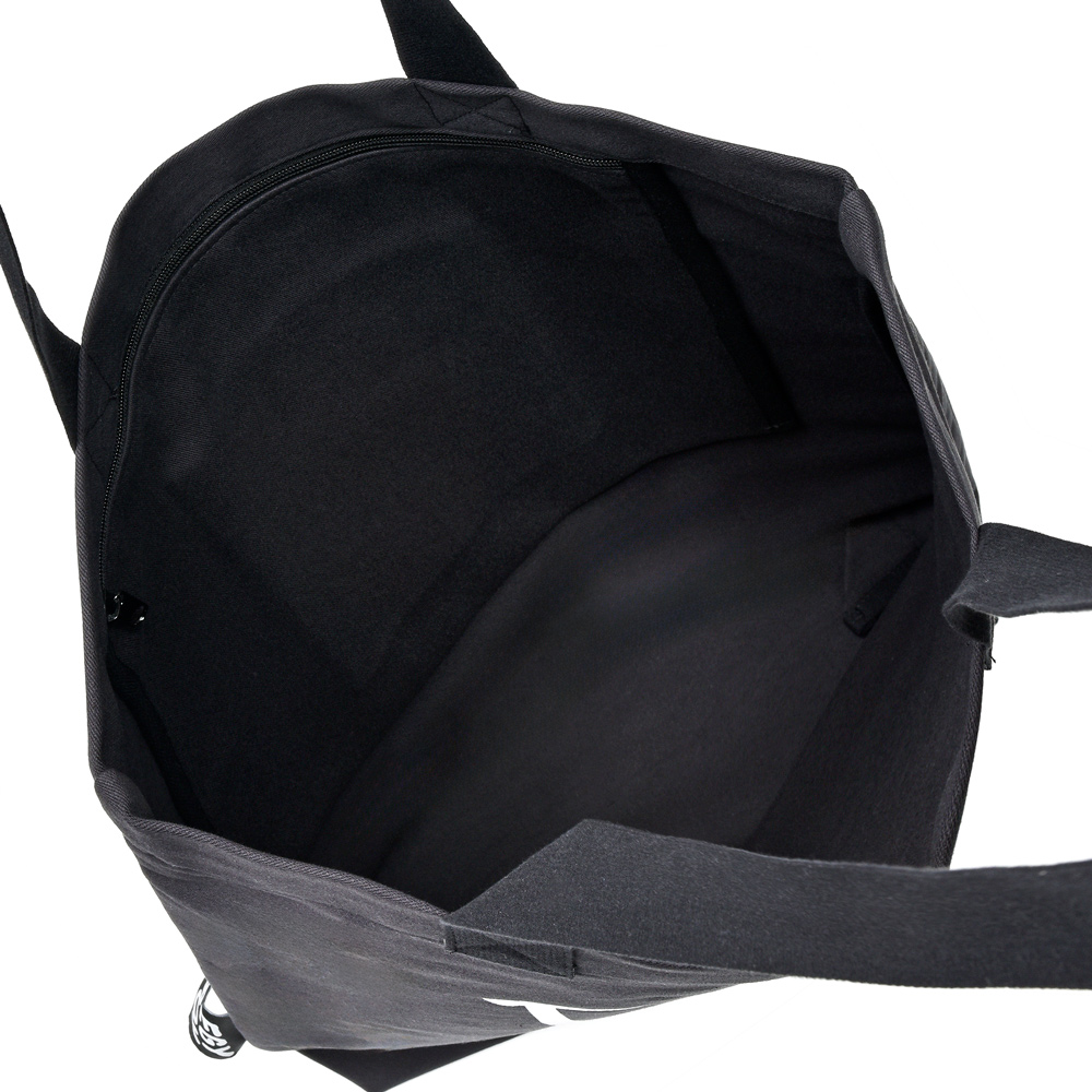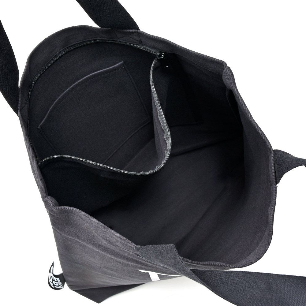 しっかりとしたコットンの生地を採用したスクエア型のトートバッグ、所謂ショッピングバッグ的なシルエットになっていまして、ハンドルは肩からかける為に長めに設定されています。また、内側にはジップポケットも装備しているのもポイント。そしてトッピングとしてやや大きめのEGYBOY(エギーボーイ)タグ、こういったところにも彼らの愛嬌を感じさせますね。