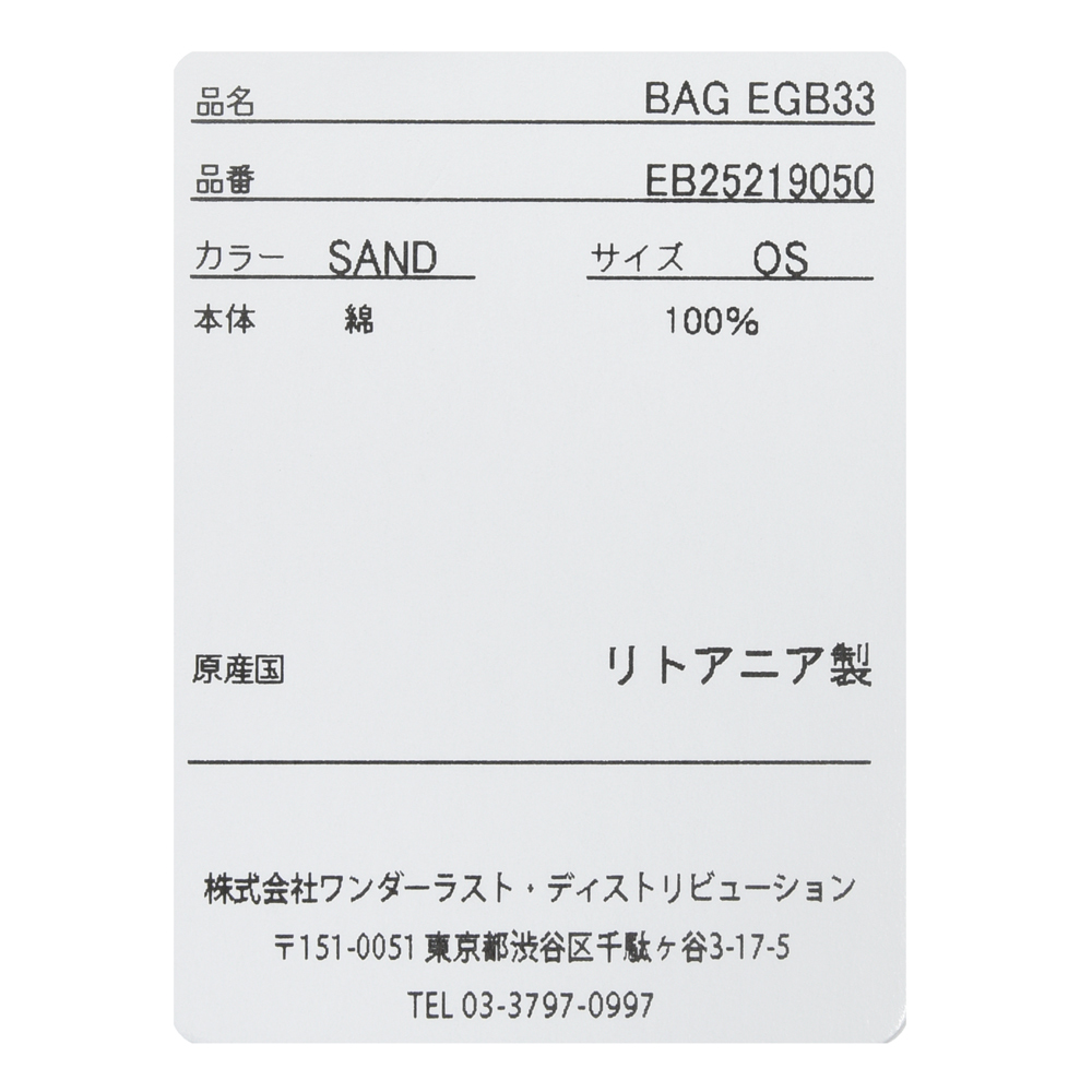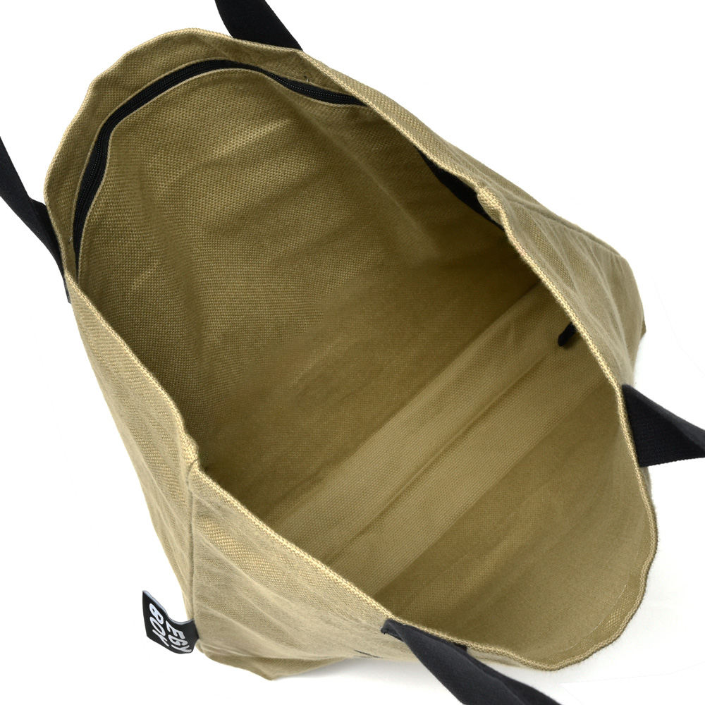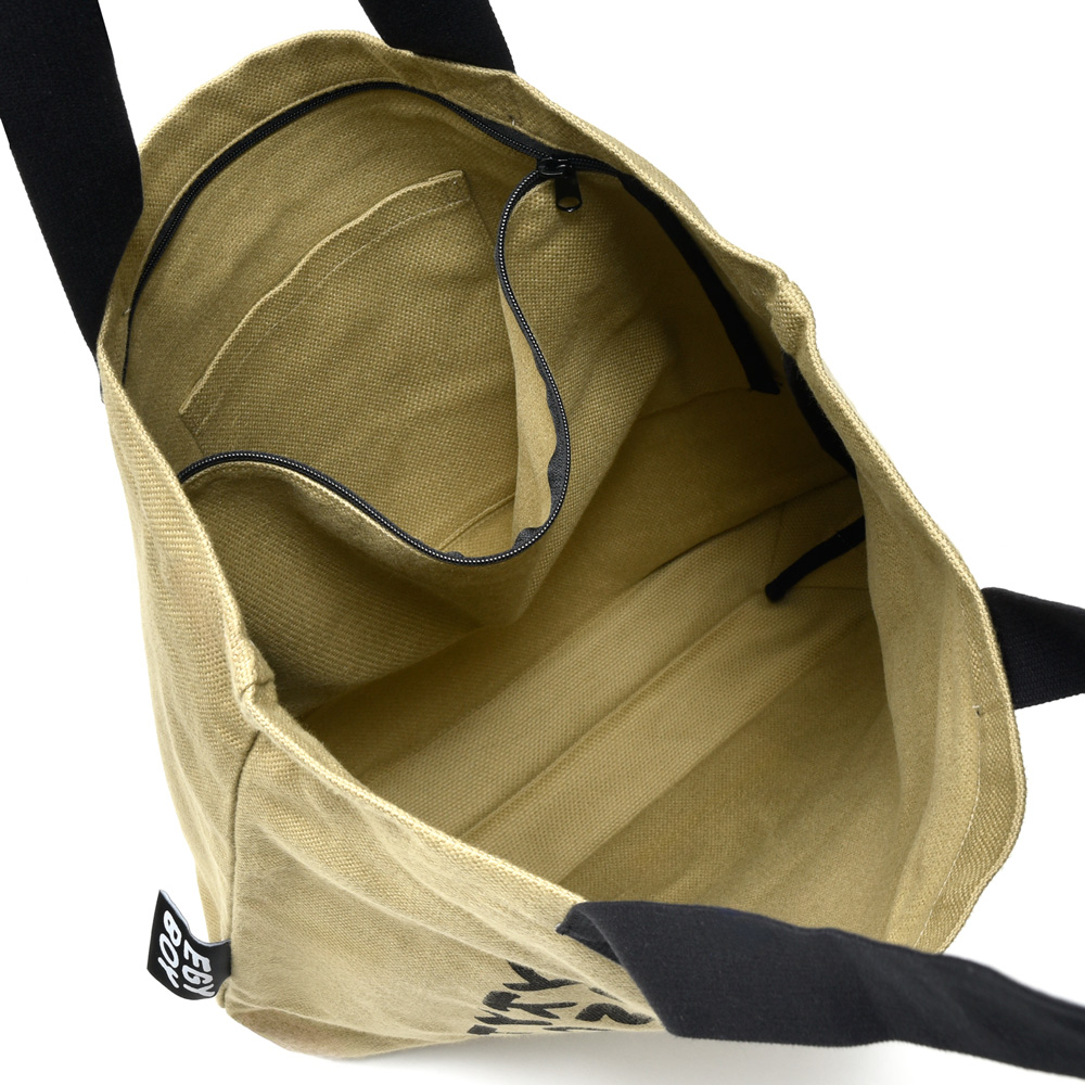 しっかりとしたコットンの生地を採用したスクエア型のトートバッグ、所謂ショッピングバッグ的なシルエットになっていまして、ハンドルは肩からかける為に長めに設定されています。また、内側にはジップポケットも装備しているのもポイント。そしてトッピングとしてやや大きめのEGYBOY(エギーボーイ)タグ、こういったところにも彼らの愛嬌を感じさせますね。