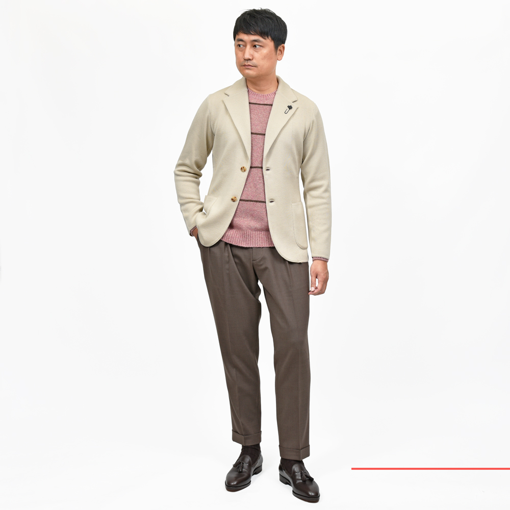 「ナチュラル・リラックス・クリーン・エレガント」、これらのキーワード全ての要素を見たしつつ、イタリアらしい色気も程よく漂わせるニットジャケット。
