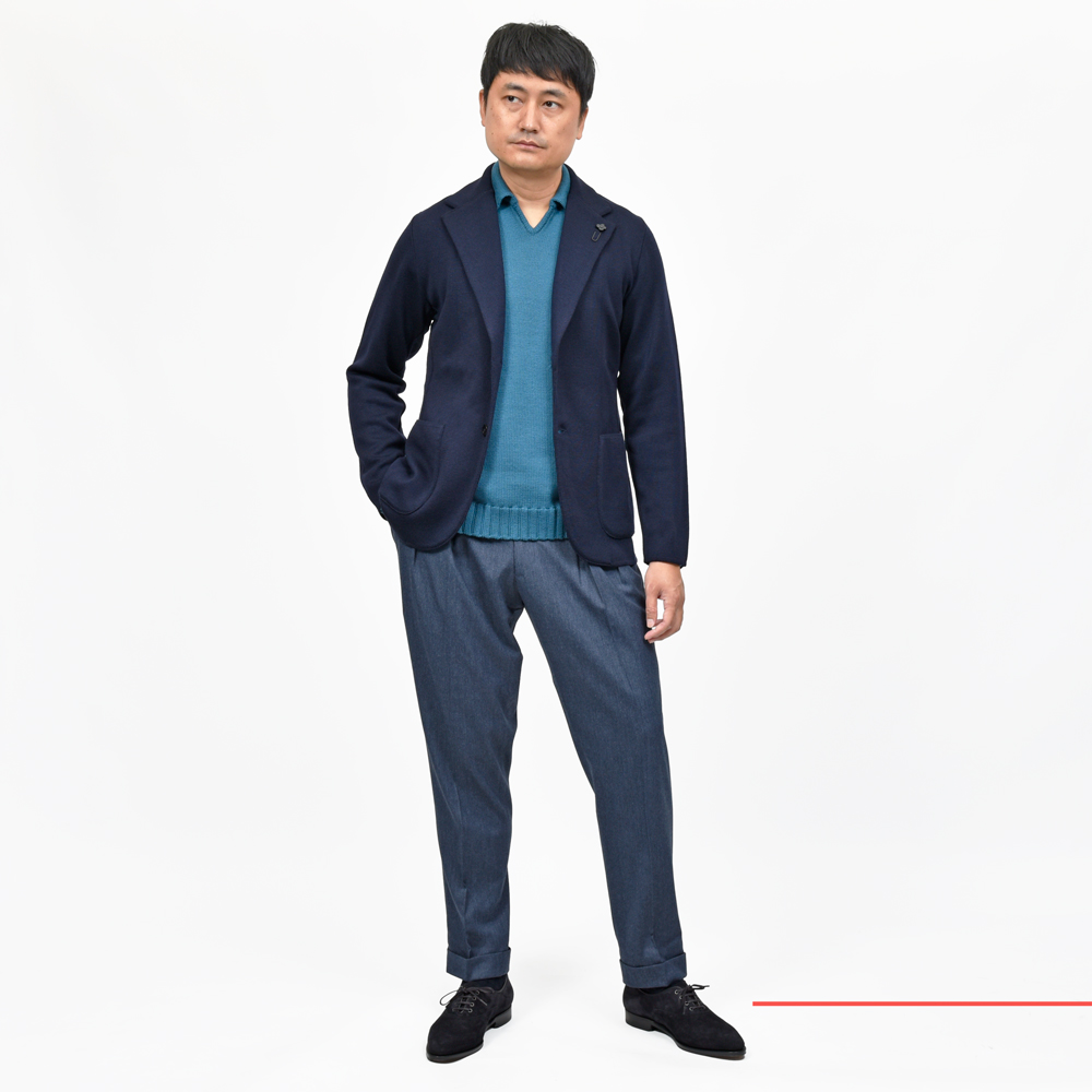 LARDINI(ラルディーニ)のニットジャケットはビジネスカジュアルスタイルを変えたと言っても過言ではない訳でして、リラックスすることが許されたビジネスシーンから会食まで使え、且つ休日の上品なスタイルまでカバーすることが出来る一着がこちらになります。