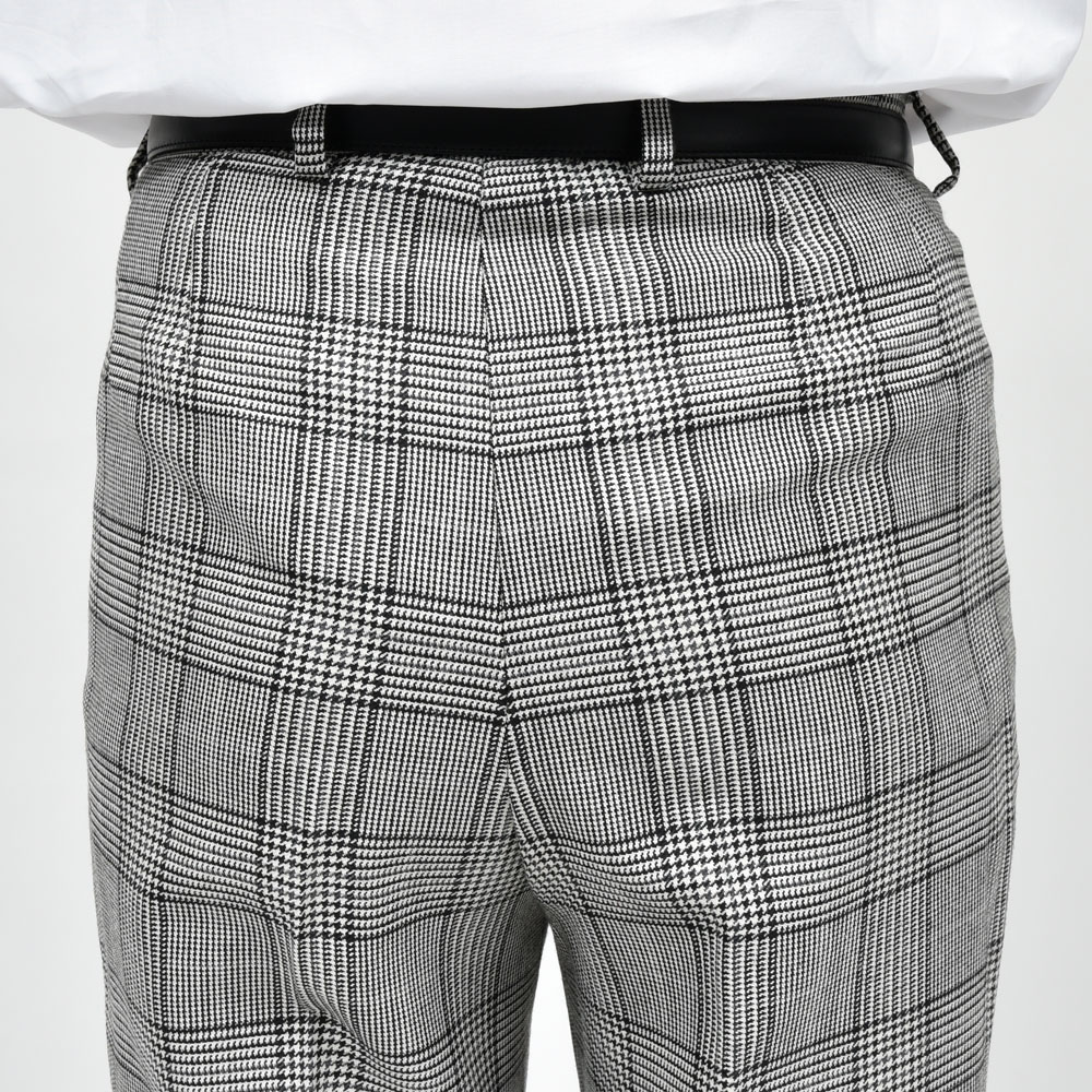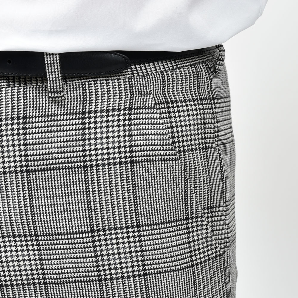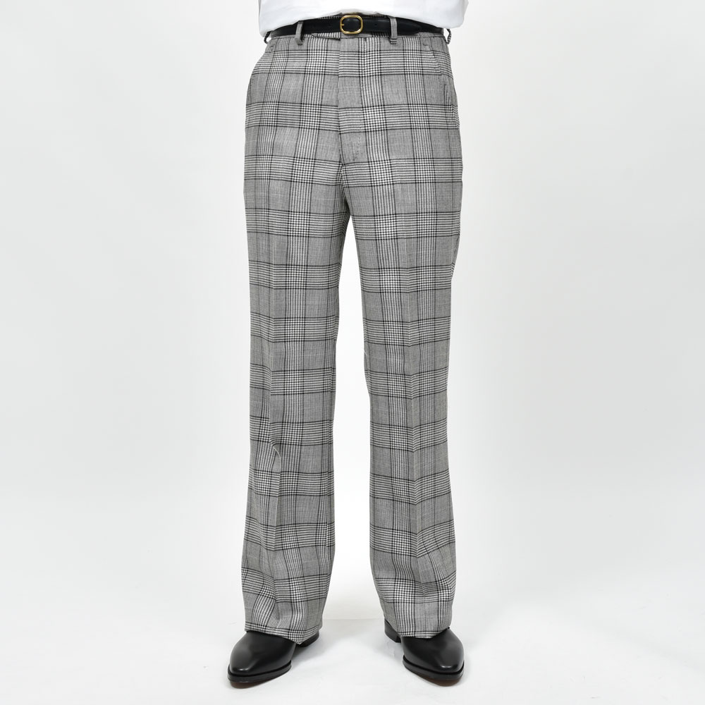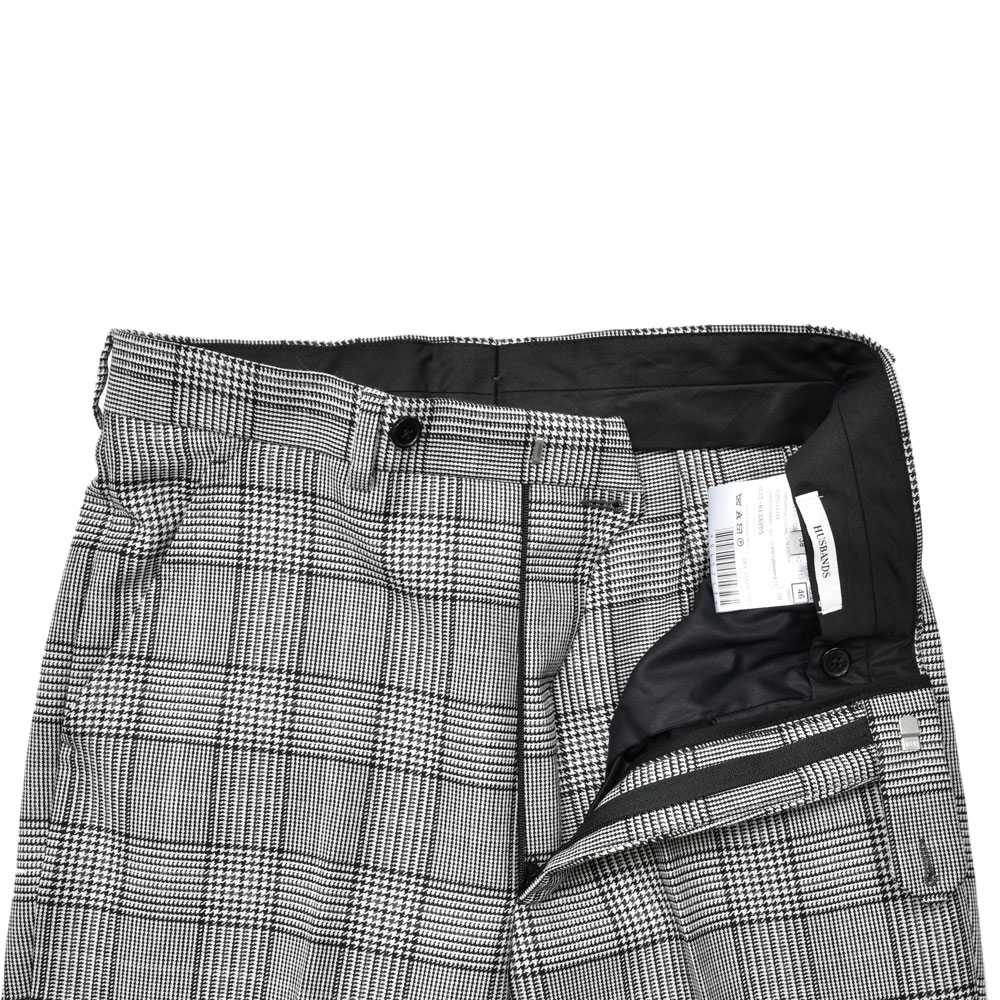 無地、ストライプ、、、と来まして次に挑戦したくなるのはやっぱりグレンチェックかなという事でご用意しました。HUSBANDS(ハズバンズ)のハウススタイルを構成する要素として必要不可欠なシルエットであるフレアタイプをチョイスしています。
