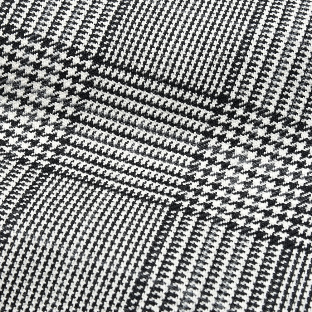 しっかりと肩パットが入ったコンケープドショルダー、存在感のあるワイドラペル、少し長めの着丈、縦のラインを意識した仕上がりに。生地はグレンチェックを採用、私たちとしては慣れ親しんだ柄ではありますが、セットするジャケットのシルエットによってここまでコンテンポラリーな雰囲気になるのかという驚きもあります。