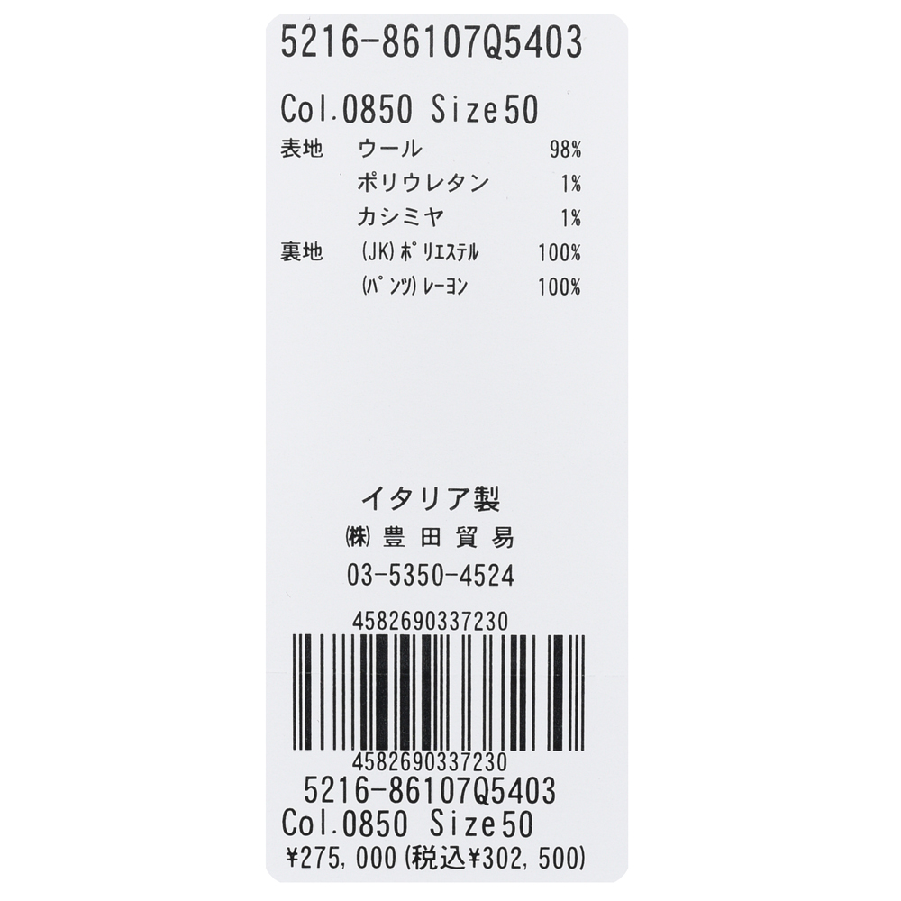 ・ファブリック:ストレッチフランネル ウール98% カシミア1% ポリウレタン1% 290g/m