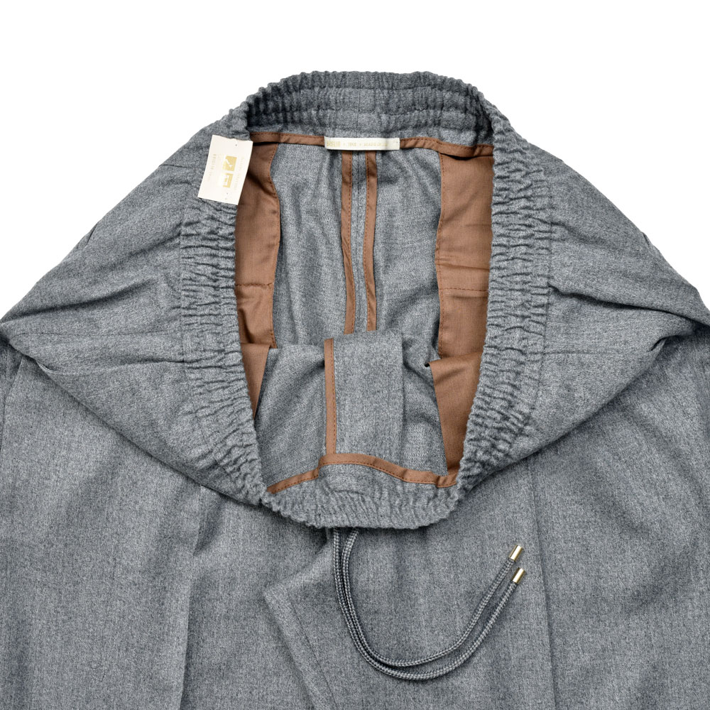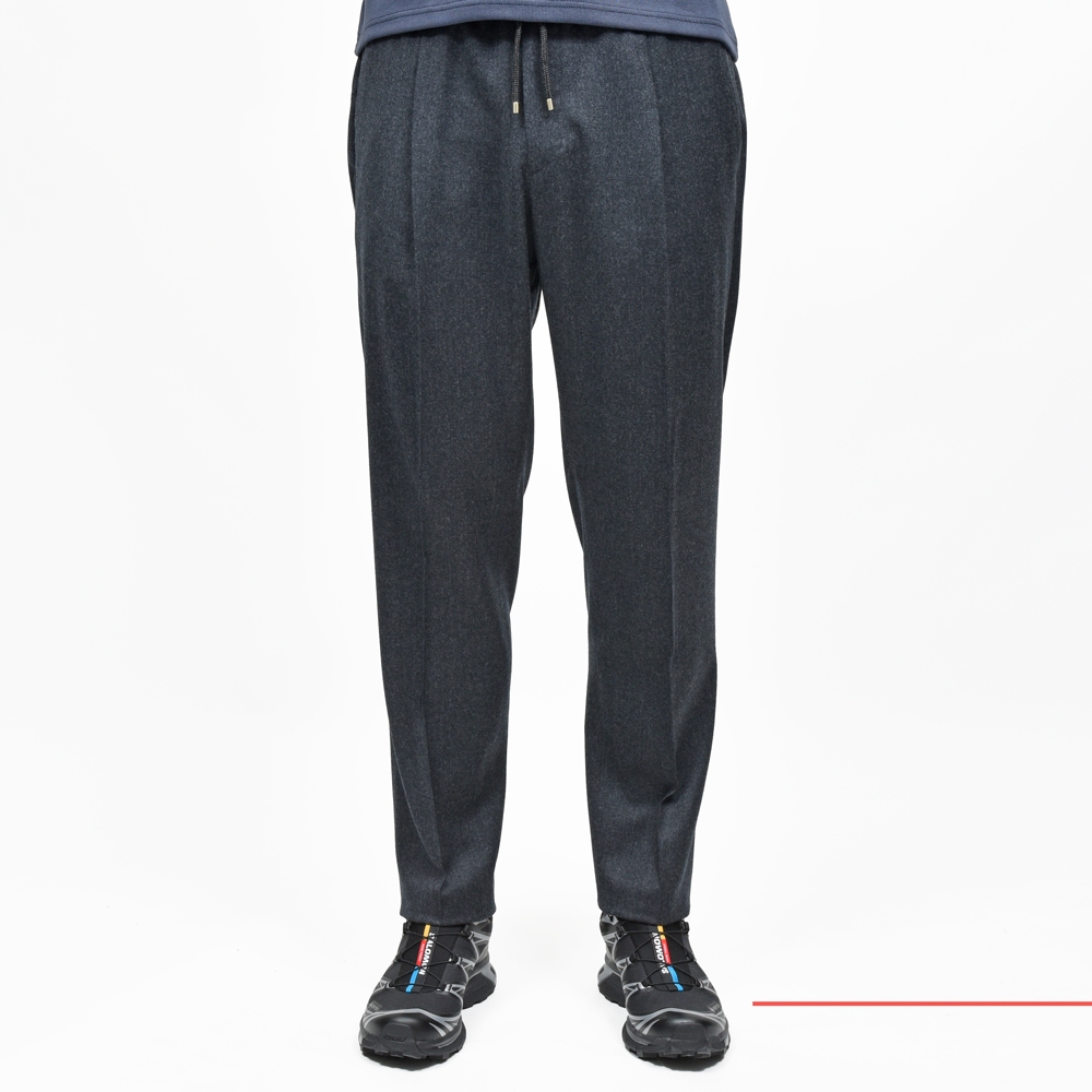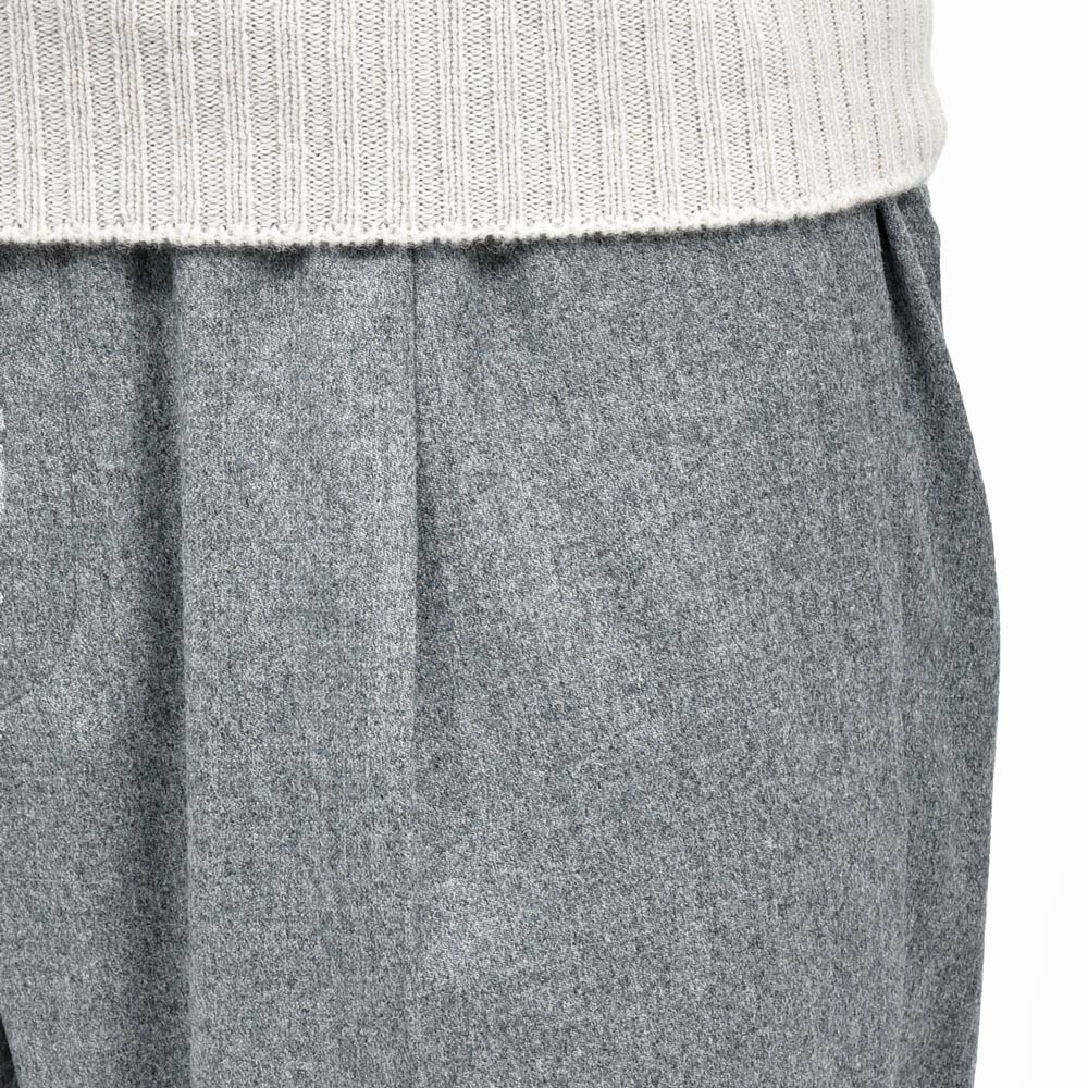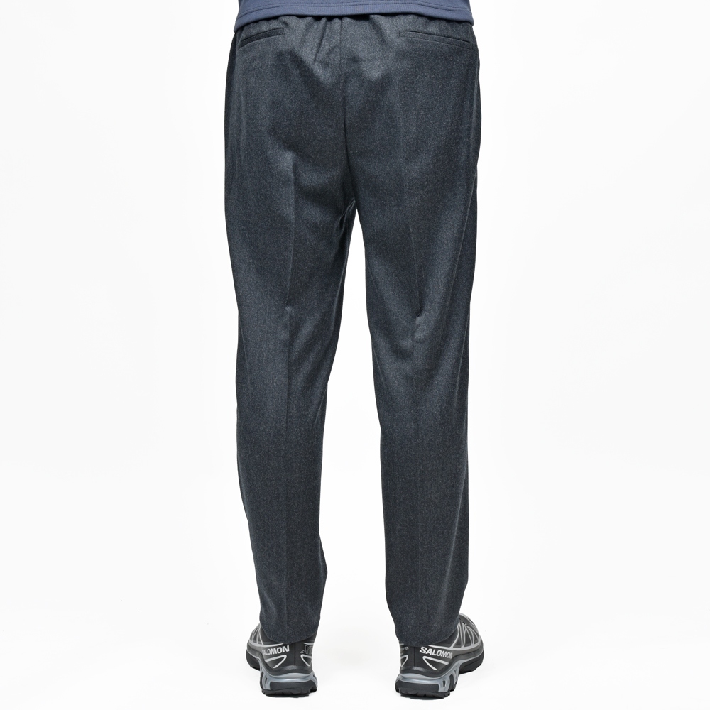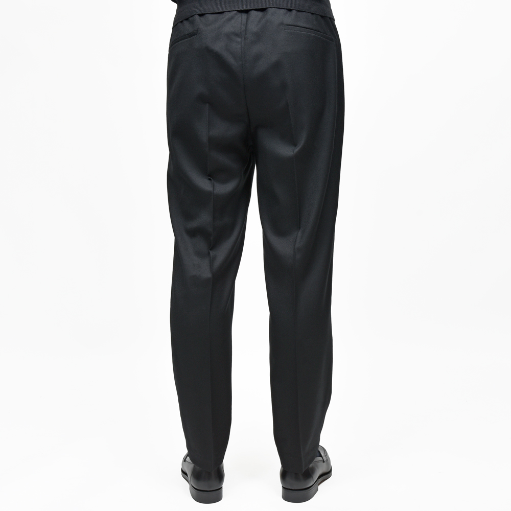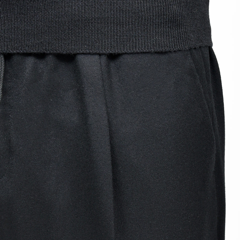 デザインは極めてシンプルで、ウエストは全面ゴムシャーリング、ドローコード付きで固定可能、細すぎず緩すぎないリラックステーパードシルエット、ウエストに立体感とサルトリアルなムードを加味する1プリーツ仕様。