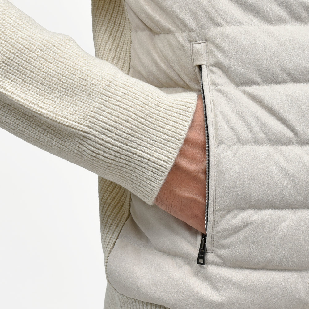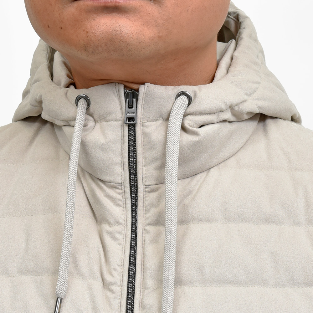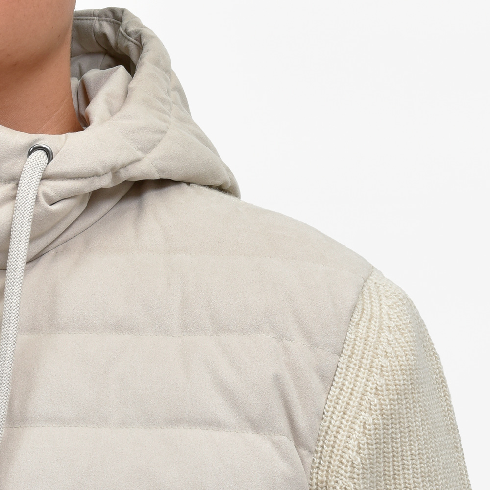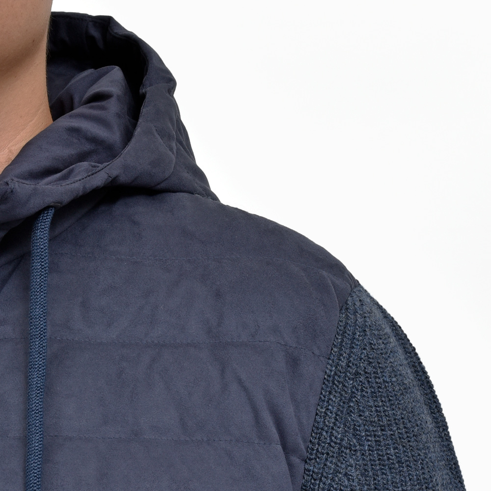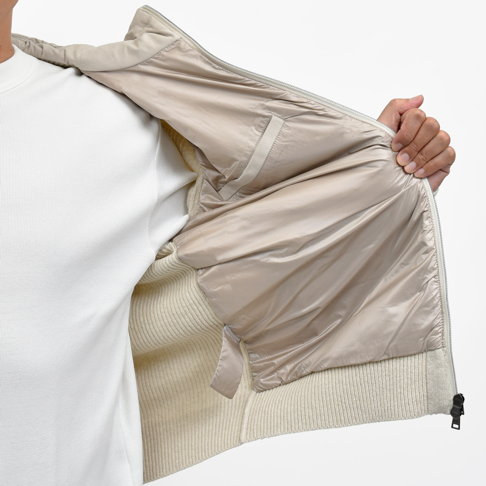 エコスエード部分に薄いダウンを入れほっこりとした温かみを表現しつつ、全体としてはスマートなバランスに仕上げています。